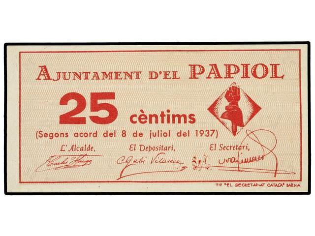 25 Cèntims. 8 Juliol 1937. Aj. d´EL PAPIOL. (Pequeños restos de adhesivo en reverso). AT-1780; T-2055. SC.