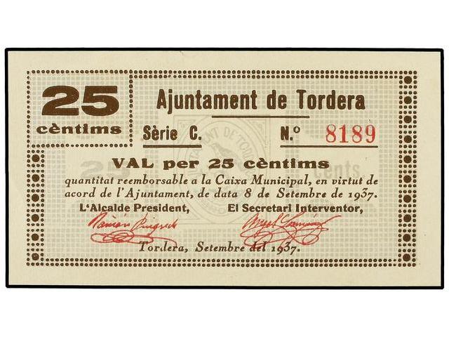 25 Cèntims. 8 Setembre 1937. Aj. deTORDERA. (Arruguita. Pequeño resto de adhesivo en reverso). AT-2512; T-2907. SC.