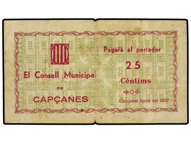 25 Cèntims. Agost 1937. C.M. de CAPÇANES. ESCASO. AT-652; T-763. MBC.
