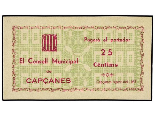 25 Cèntims. Agost 1937. C.M. de CAPÇANES. Sin impresión en reverso. Acento abierto en ´Cèntims´. (Pequeña doblez en esquina). AT-652d; T-763d. SC.