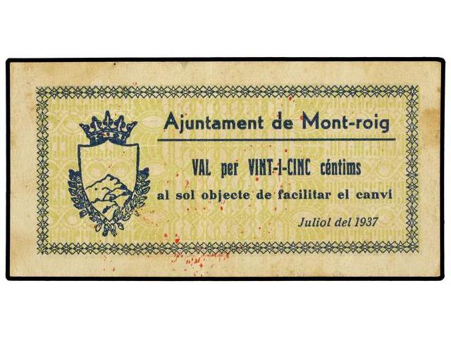 25 Cèntims. Juliol 1937. Aj. de MONT-ROIG. Acento agudo en ´céntims´ en anverso y reverso. (Pequeñas manchitas). AT-1602a; T-1838a. EBC-.