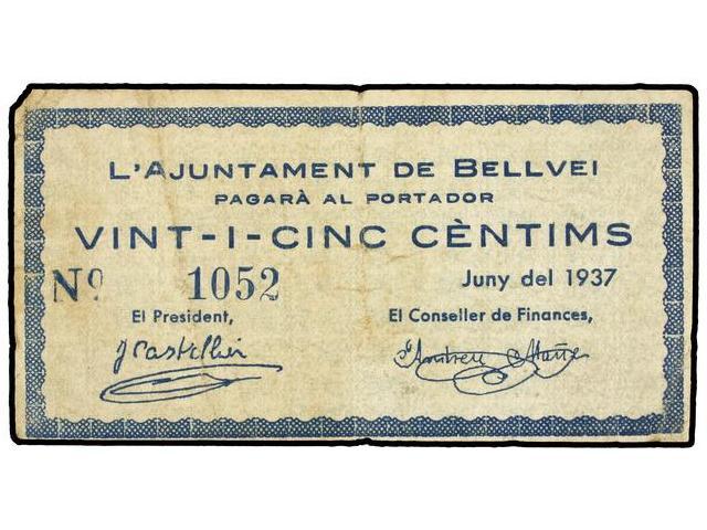 25 Cèntims. Juny 1937. Aj. de BELLVEI. (Sucio). ESCASO. AT-390; T-463. MBC.
