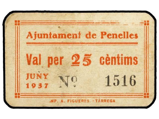 25 Cèntims. Juny 1937. Aj. de PENELLES. Cartón. ESCASO. AT-1801; T-2085. MBC.