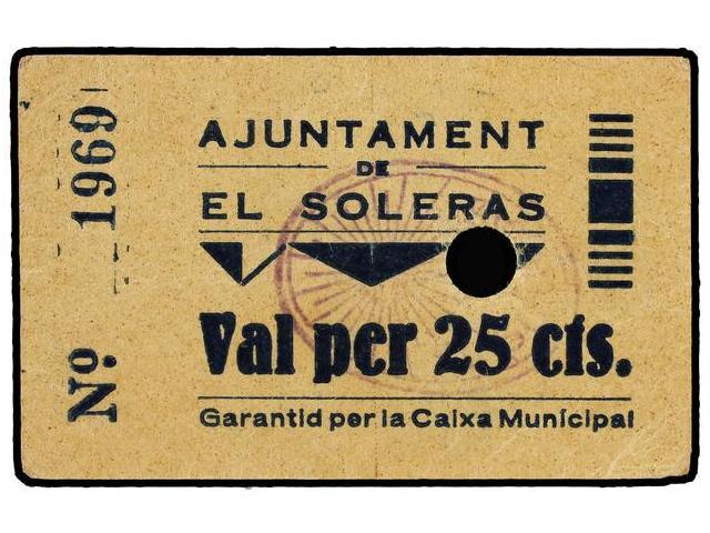 25 Cèntims. S/F. Aj. d´EL SOLERAS. Cartón. Taladro central 7 mm. ESCASO. AT-2385; T-2764. EBC-.