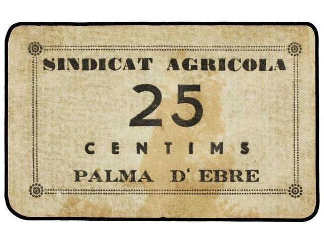 25 Cèntims. SINDICAT AGRÍCOLA PALMA D´EBRE. Cartón. (Manchas). RARÍSIMO. T-2043. MBC+.