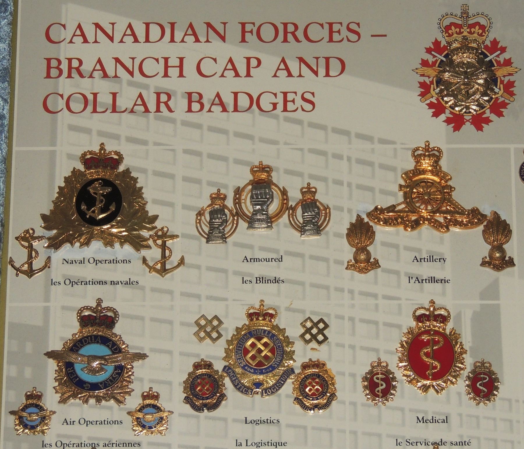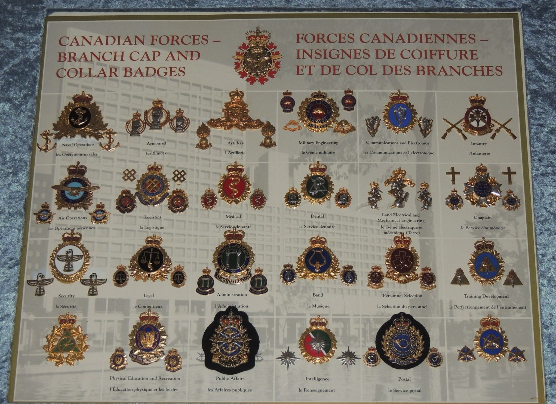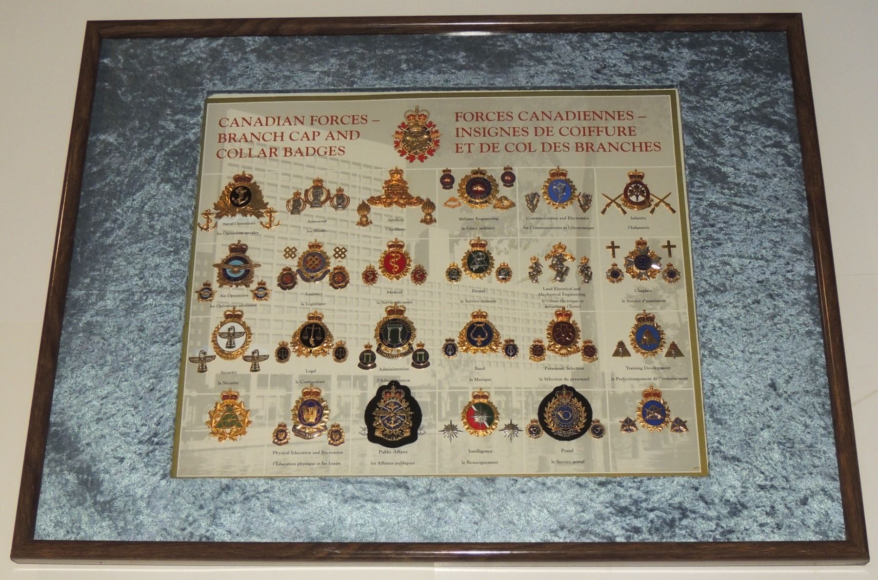 COLLAR BADGES 74 INSIGNIA TOTAL INCLUDING COLLARS IN 33X25 INCH FRAME CANADIAN ARMED FORCES MILITARY LATE 20TH CENTURY
