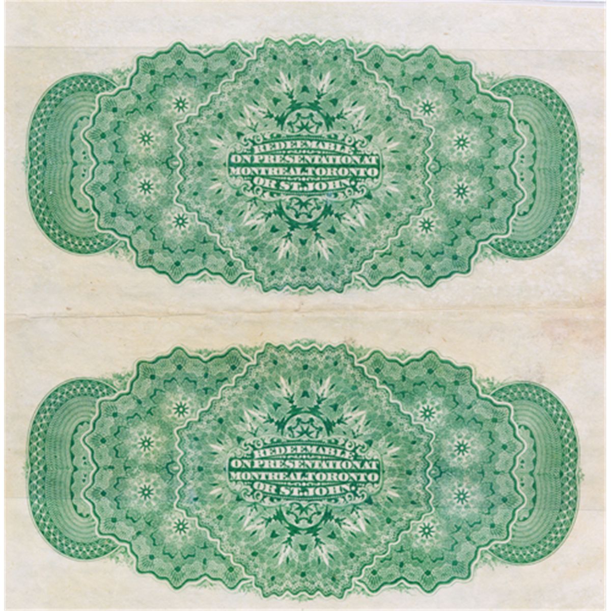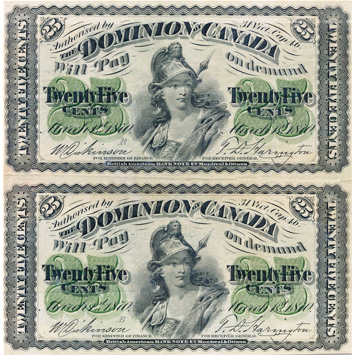25 CENTS. 1870. Letter ‘B’ below date. DC-1b. An uncut Pair. The top note with Large ‘B’, the lower note with ‘Small ‘B’. Very Fine.