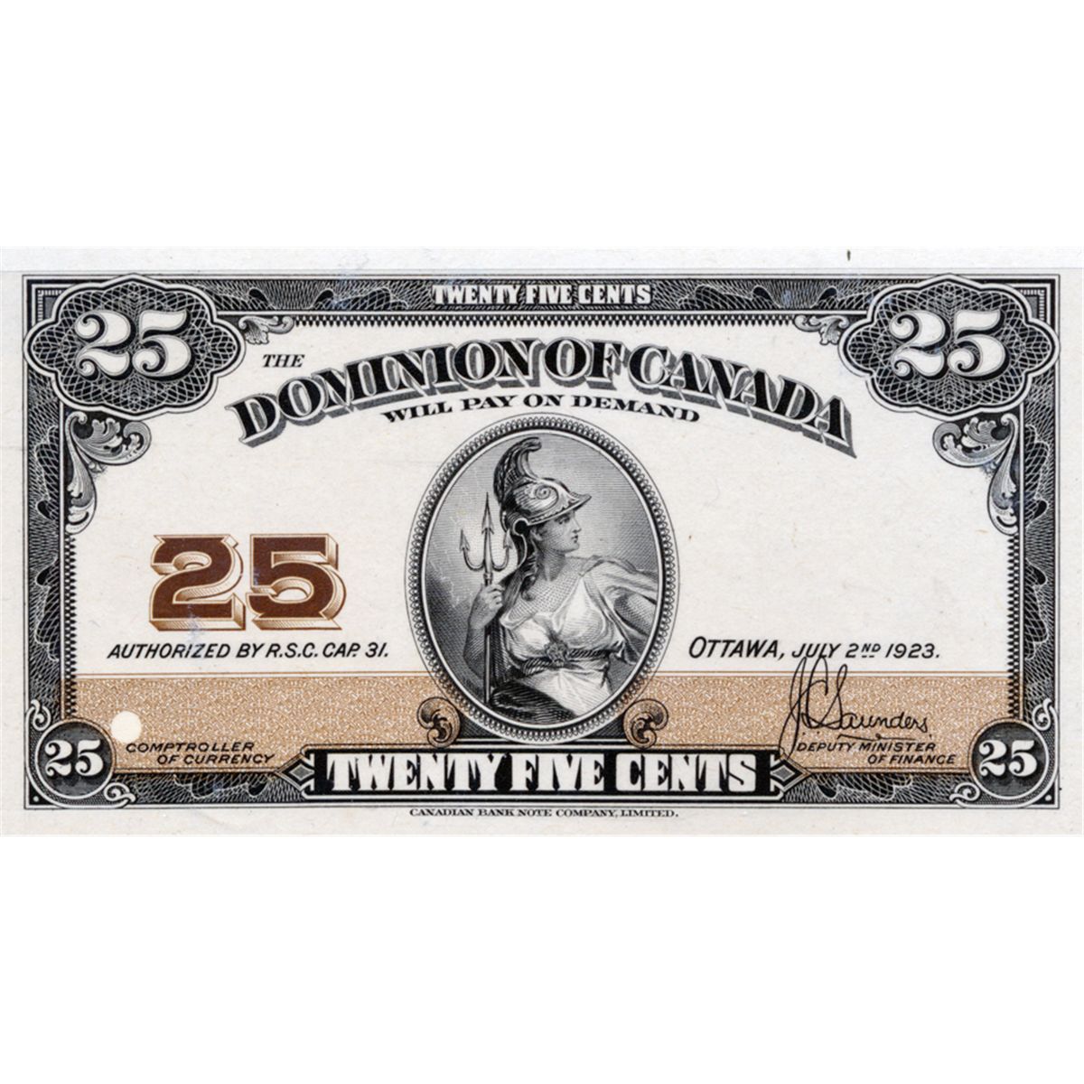 25 CENTS. July 2, 1923. DC-24aP. Full colour thin paper Face and Back Proofs, on original card backi