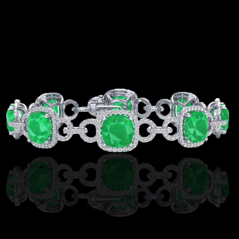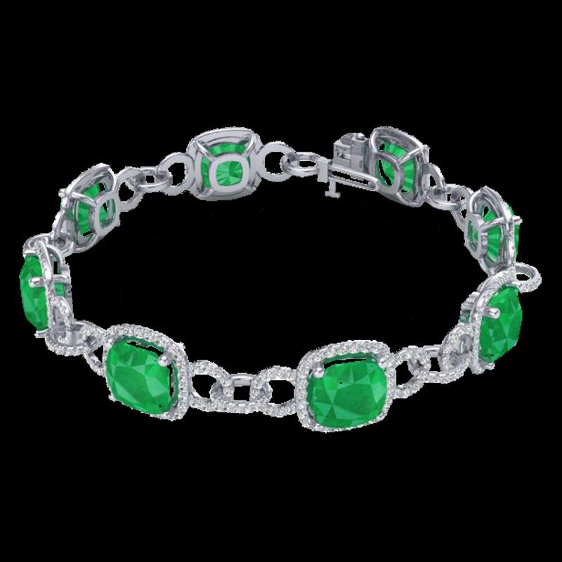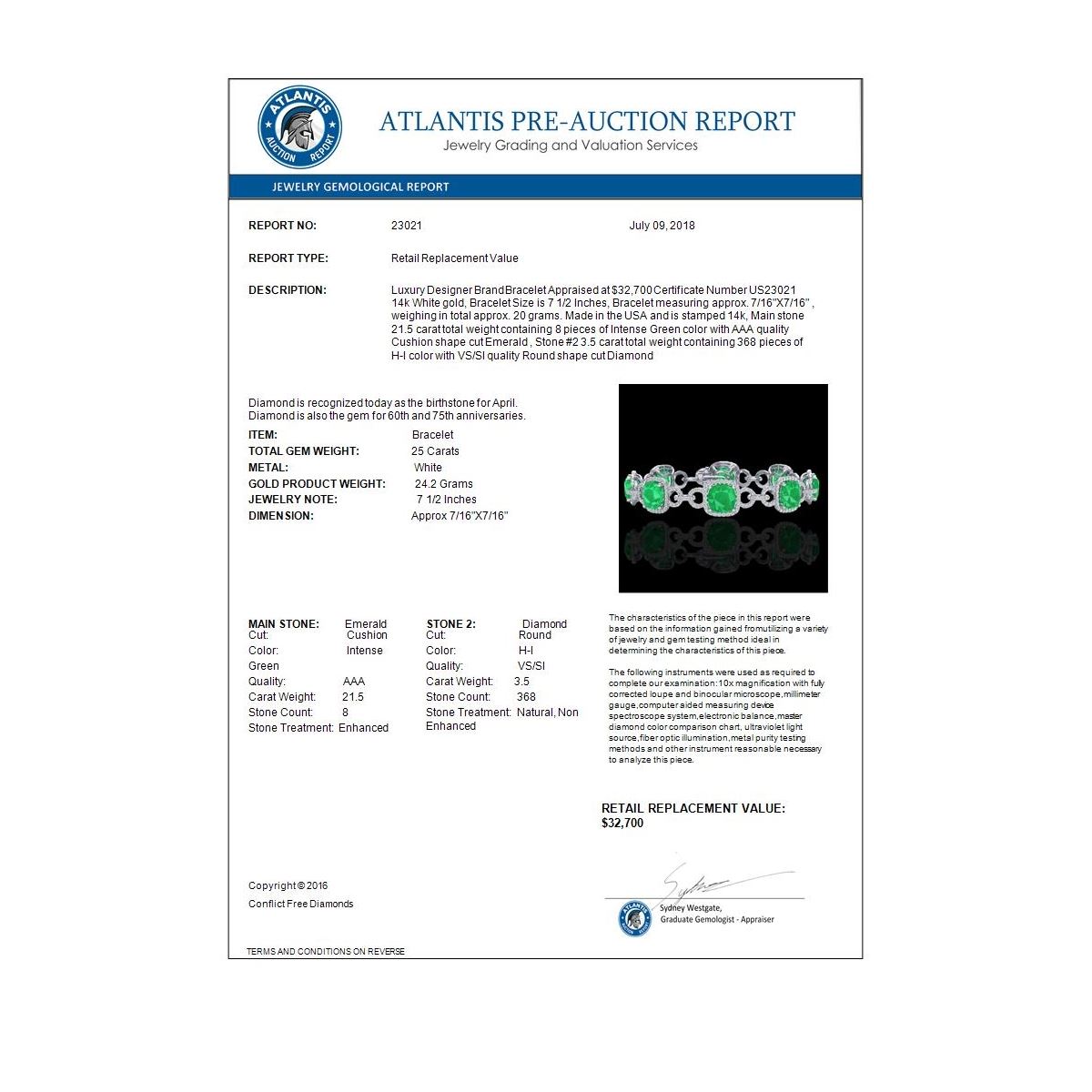 REF-457W3F -23021 ---- 25 CTW Emerald & Micro VS/SI Diamond Bracelet 14K White Gold ---- Luxury Designer Brand Bracelet Appraised at $32,700 Certificate Number US23021  14k White gold,  Bracelet Size is 7 1/2 Inches, Bracelet measuring approx. 7/16"X7/16" , weighing in total approx. 20 grams. Made in the USA and is stamped 14k, Main stone 21.5 carat total weight containing 8 pieces of Intense Green color with AAA quality Cushion shape cut Emerald , Stone #2 3.5 carat total weight containing 368 pieces of H-I color with  VS/SI quality Round shape cut Diamond