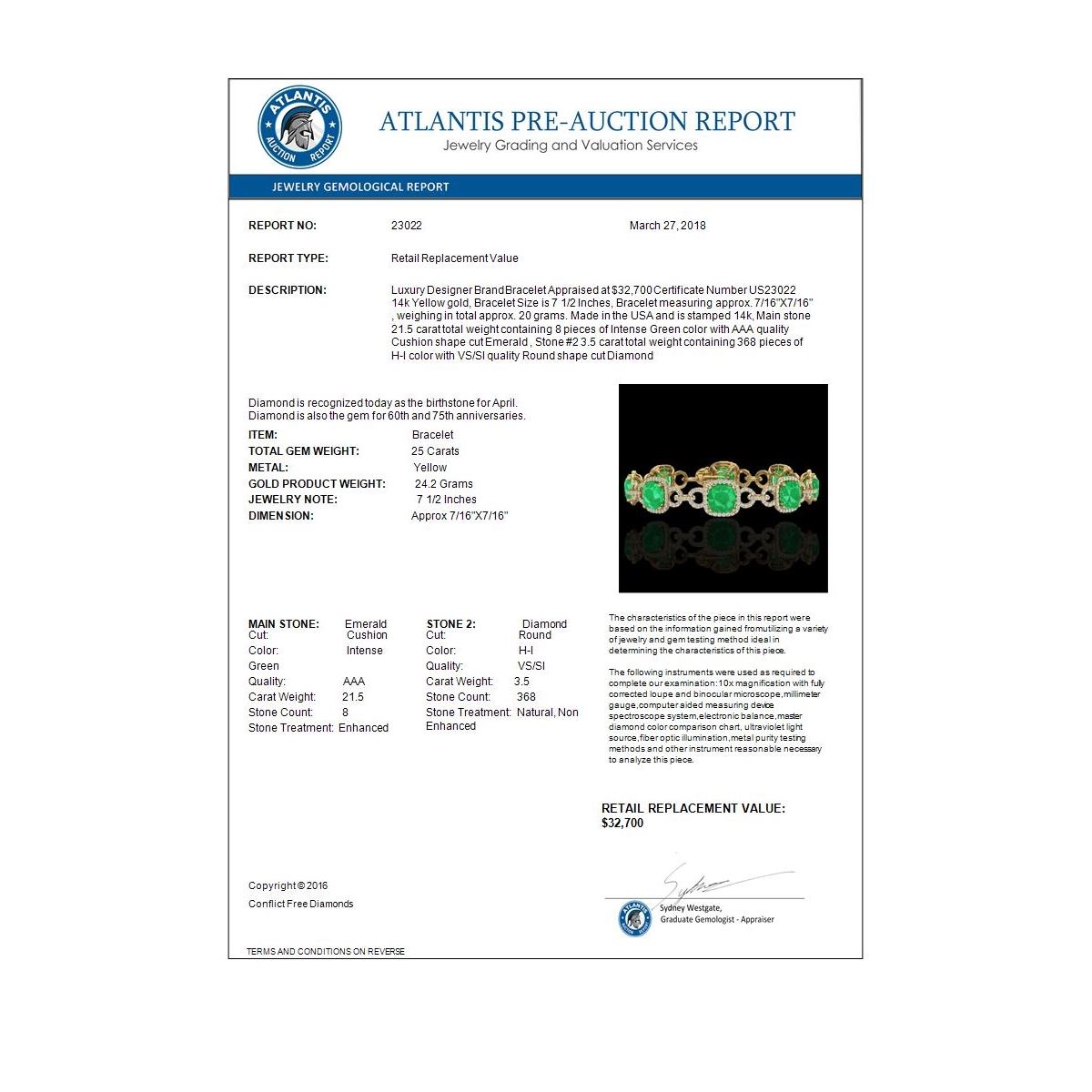 REF-457T3M -23022 ---- 25 CTW Emerald & Micro VS/SI Diamond Bracelet 14K Yellow Gold ---- Luxury Designer Brand Bracelet Appraised at $32,700 Certificate Number US23022 14k Yellow gold, Bracelet Size is 7 1/2 Inches, Bracelet measuring approx. 7/16"X7/16" , weighing in total approx. 20 grams. Made in the USA and is stamped 14k, Main stone 21.5 carat total weight containing 8 pieces of Intense Green color with AAA quality Cushion shape cut Emerald , Stone #2 3.5 carat total weight containing 368 pieces of H-I color with VS/SI quality Round shape cut Diamond
