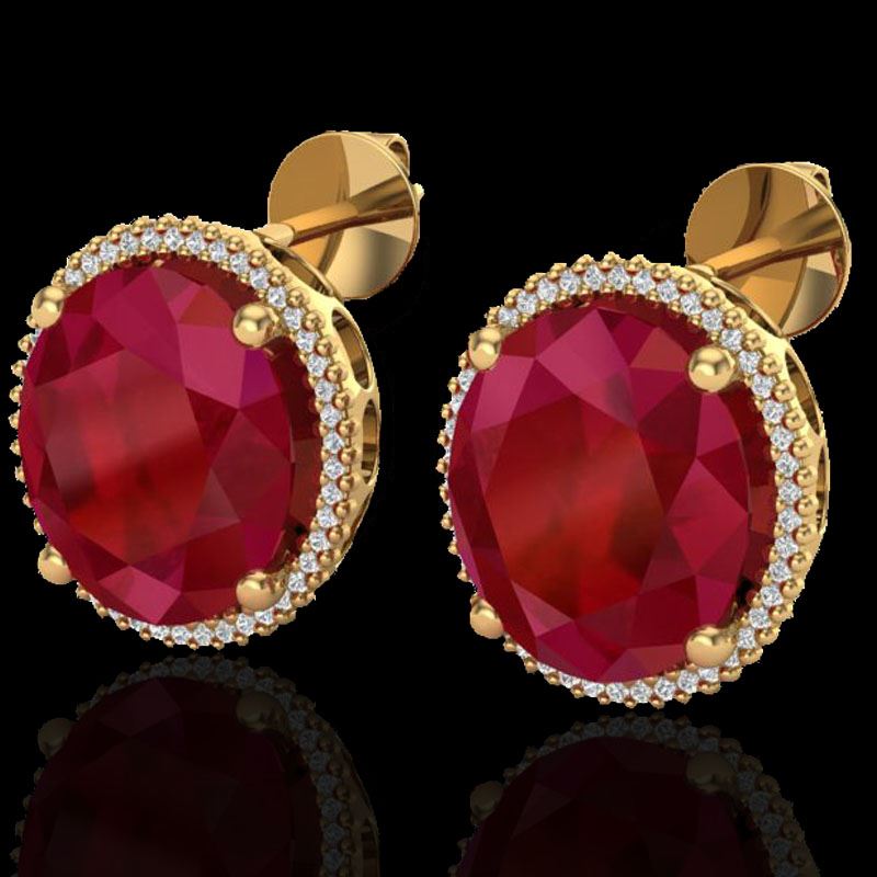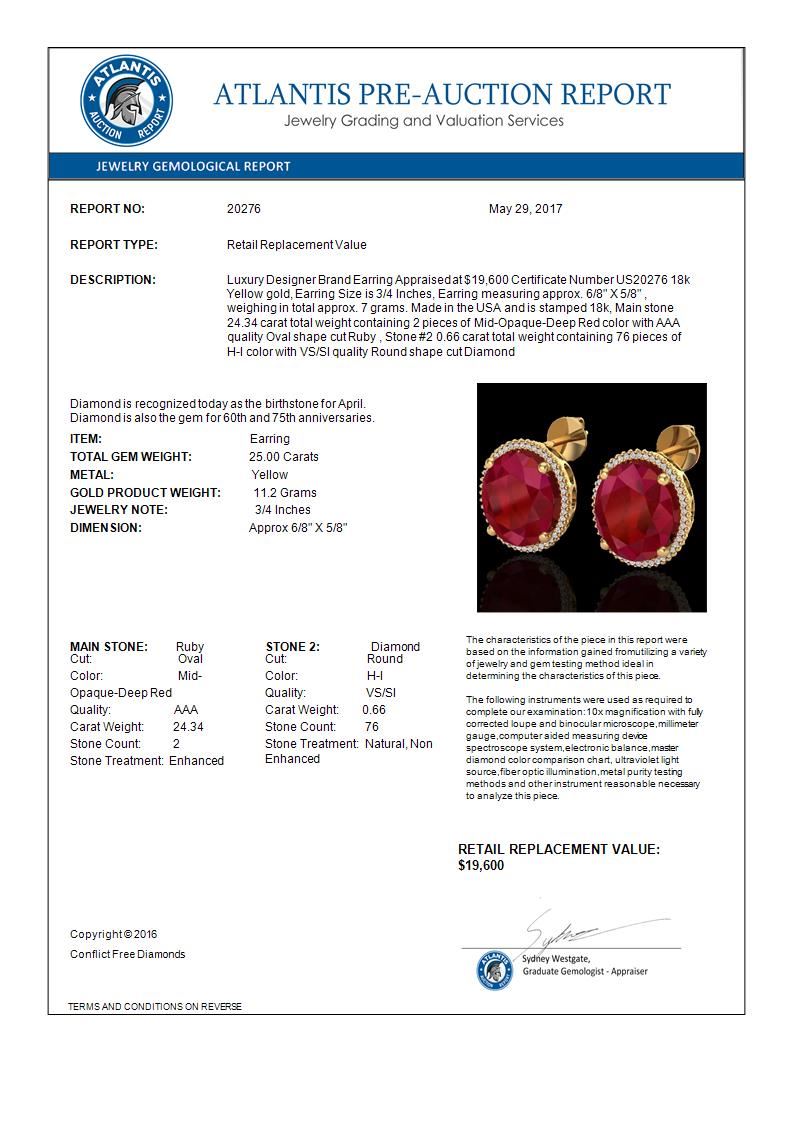 25 CTW Ruby & Micro Pave VS/SI Diamond Certified Halo Earrings 18K Yellow Gold ---- Luxury Designer Brand Earring Appraised Retail Price at $19,600 ---- SKU Number US20276 18k Yellow gold Earring Size is 3/4 Inches, Earring measuring approx. 6/8" X 5/8" , weighing in total approx. 7 grams. Made in the USA and is stamped 18k, Main stone 24.34 carat total weight containing 2 pieces of Mid-Opaque-Deep Red color with AAA quality Oval shape cut Ruby , Stone #2 0.66 carat total weight containing 76 pieces of H-I color with VS/SI quality Round shape cut