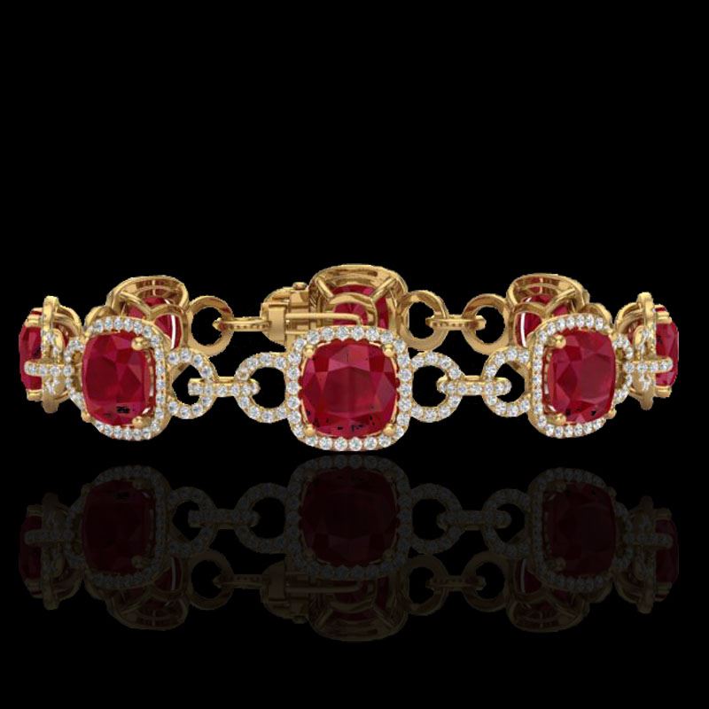 25 CTW Ruby & Micro VS/SI Diamond Certified Bracelet 14K Yellow Gold ---- Luxury Designer Brand Bracelet Appraised Retail Price at $32,700 ---- SKU Number US23029 14k Yellow gold Bracelet Size is 7 1/2 Inches, Bracelet measuring approx. 7/16"X7/16" , weighing in total approx. 20 grams. Made in the USA and is stamped 14k, Main stone 21.50 carat total weight containing 8 pieces of Mid-Opaque-Deep Red color with AAA quality Cushion shape cut Ruby , Stone #2 3.5 carat total weight containing 368 pieces of H-I color with VS/SI quality Round shape cut