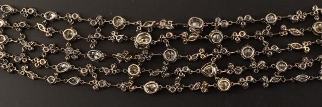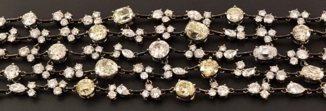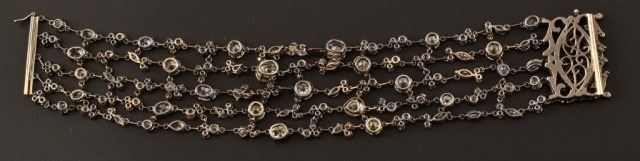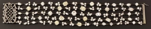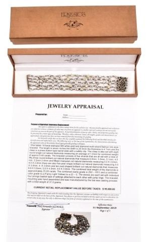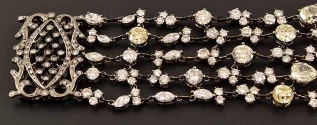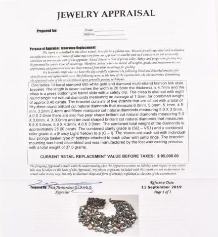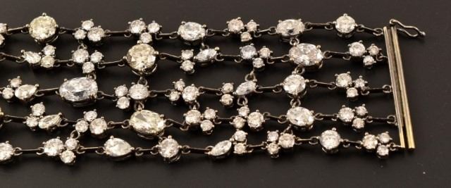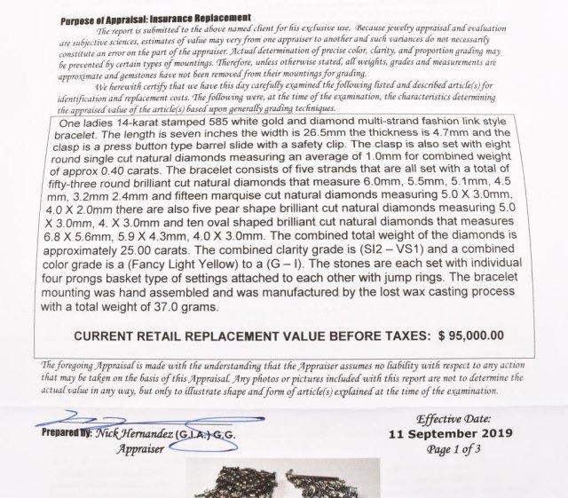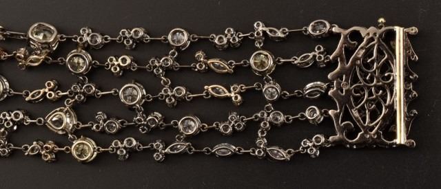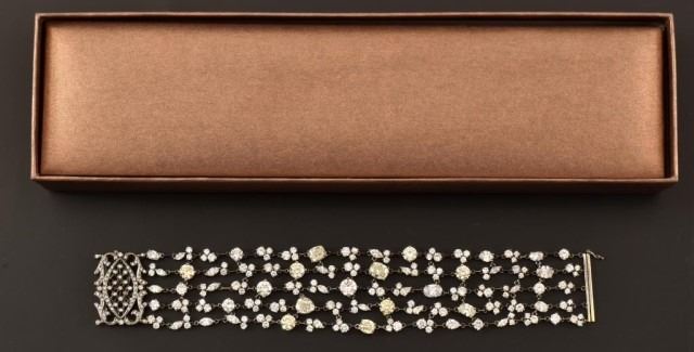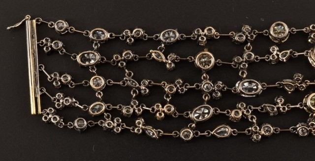 Ladies 14k 585 white gold and diamond multi-strand fashion link style bracelet. 4.7mm thick x 26.5mm wide x 7 inches long, with a press button type barrel slide clasp with safety clip. The clasp is also set with 8 round single cut natural diamonds, measuring an average of 1.0mm for combined weight of approx. .40 carats. The bracelet consists of five strands that are all set with with a total of 53 round brilliant cut natural diamonds that measure 6.0mm, 5.5mm, 5.1mm, 4.5mm, 3.2mm, 2.4mm and fifteen marquise cut natural diamonds measuring 5.0 x 3.0 mm, 4.0 x 2.0mm. There are also five pear shape brilliant cut natural diamonds measuring 5.0 x 3.0 mm, 4.0 x 3.0 mm, and ten oval shaped brilliant cut natural diamonds that measure 6.8 x 5.6mm, 5.9 x 4.3mm, 4.0 x 3.0mm. The combined total weight of the diamonds is approximately 25.00 carats. The combined clarity grade is (SI2-VS1) and a combined color grade is a (Fancy Light Yellow) to a (G-I). The stones are each set with individual four prong basket-type settings attached to each other with jump rings. The bracelet mounting was hand assembled and manufactured by lost wax casting process with a total weight of 37.0 grams. Appraisal value of $95,000.
