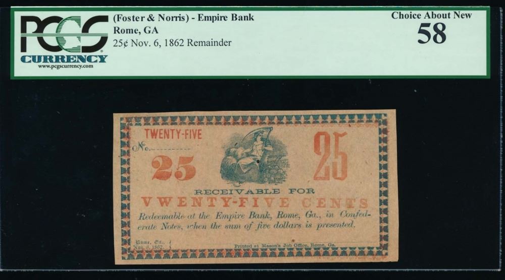 One 25 Cent 1862 Merchant Script Note PCGS 58.