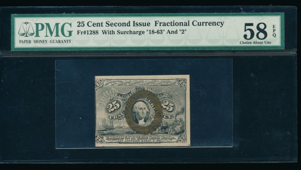 One 25 Cent Second Issue Fractional PMG 58EPQ.
