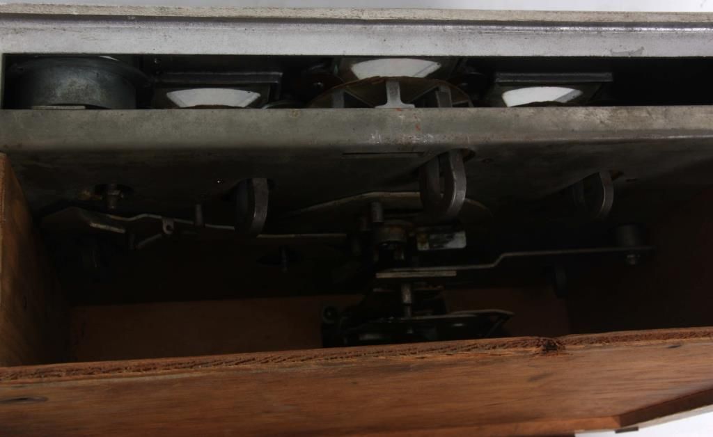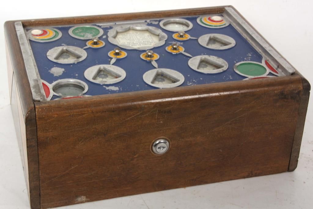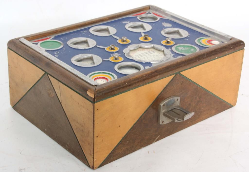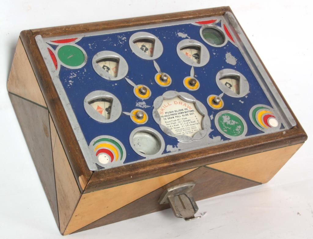 25 Cent Skill Draw Trade Stimulator. 2 tone wood case with cast top, painted blue with nickel colored escutcheons, red, yellow & green highlights. 5 spinning wheels indicate the card being played and each wheel has a hold button; insert the coin, push the slide in and pull out to spin the wheels. Manufactured by Charles Fey & Sons, circa 1932-1937. Has some minor paint loss on the top. 6 in. high x 15 in. wide x 15 in. deep.