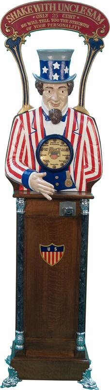 25 Cent Uncle Sam Hand Shaker, Very Nice Recreation On 1/4 Sawn Oak Cabinet - 75" Tall