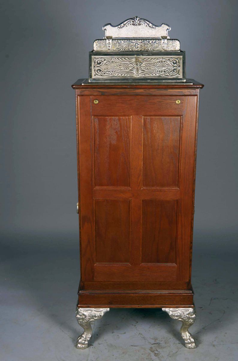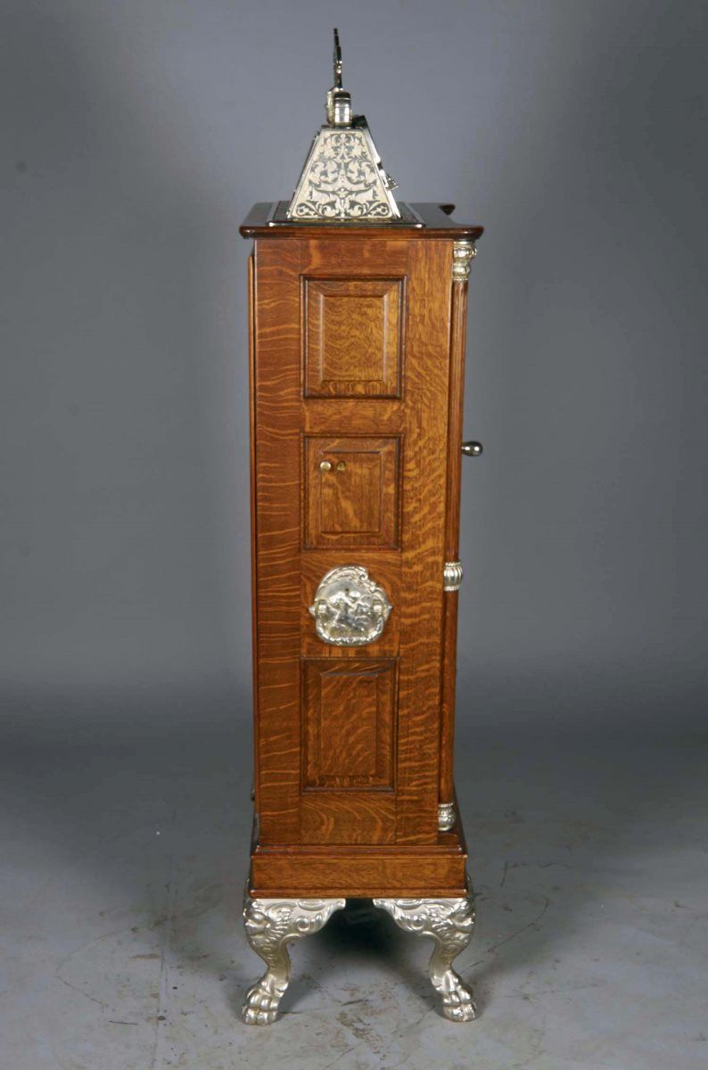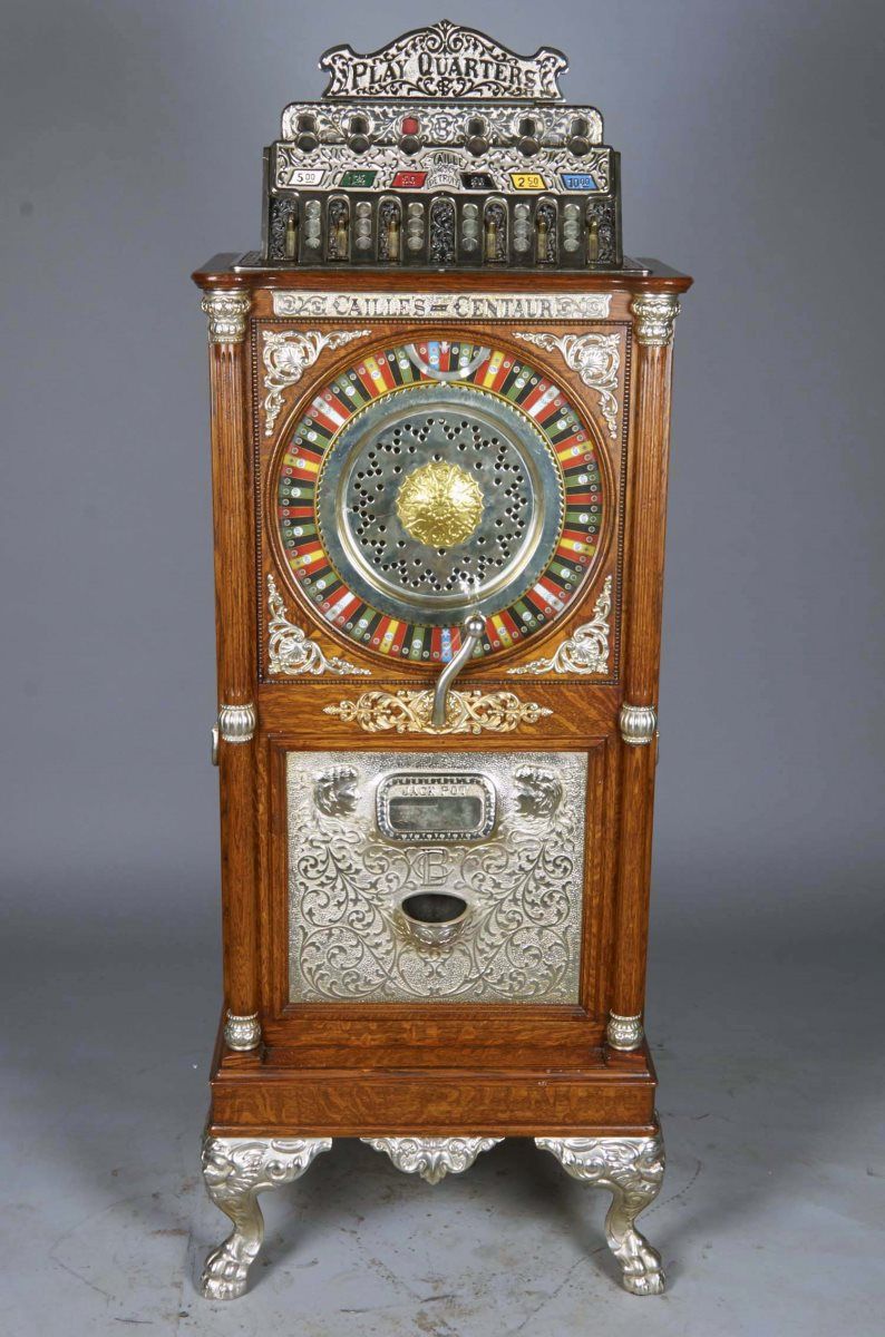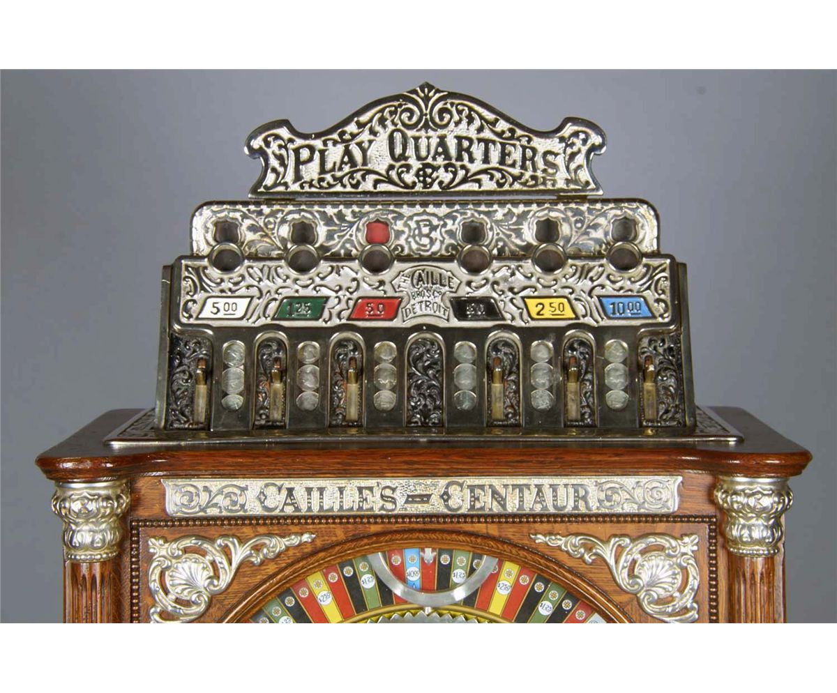 25 Cent Caille's Centaur floor wheel slot machine c1907 by The Caille Bros. Co. Detroit. Wood clawfoot upright cabinet features jackpot and "Play Quarters" top sign. This Caille was part of the Las Vegas Golden Nugget slot machine collection and was on di