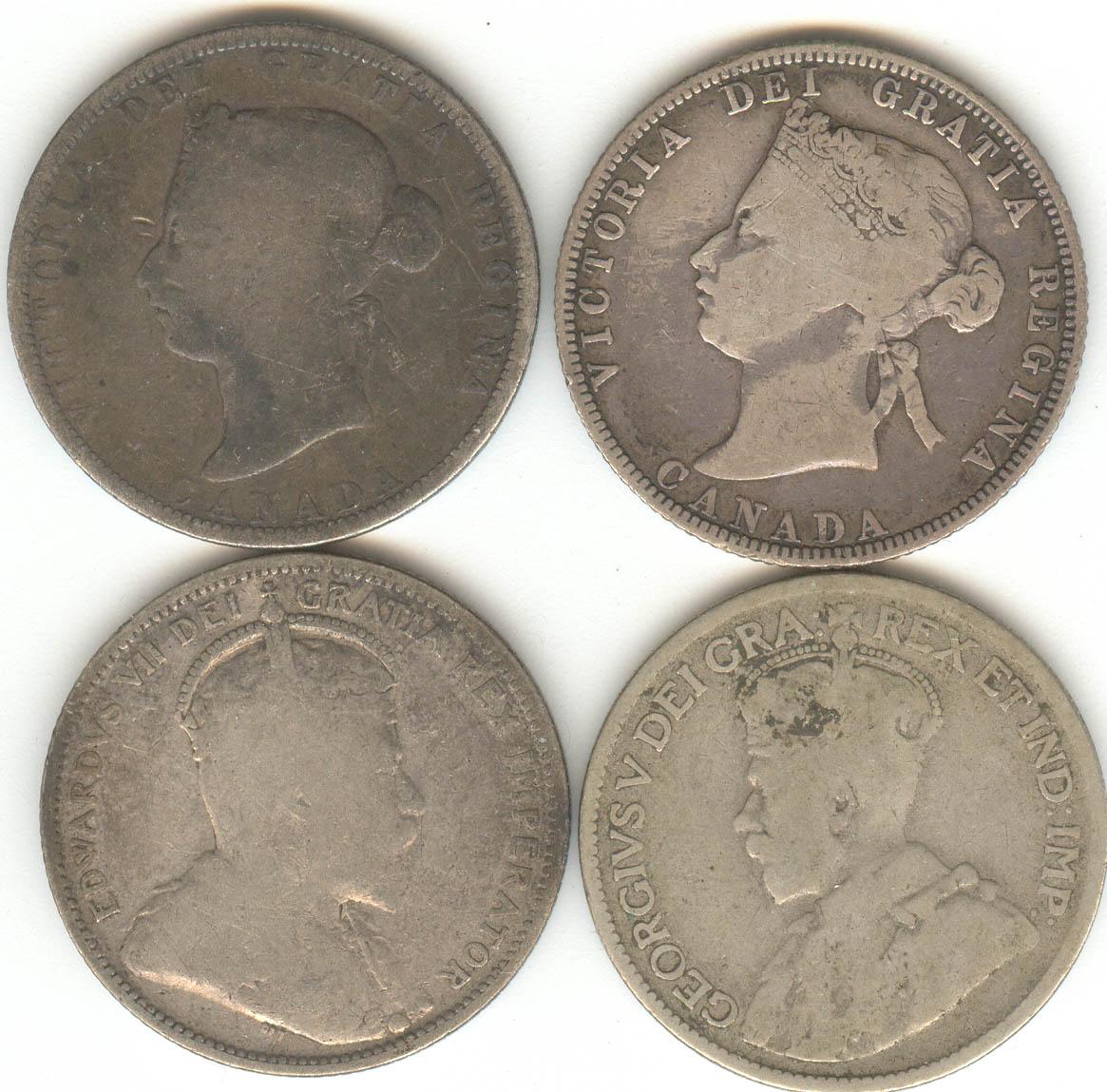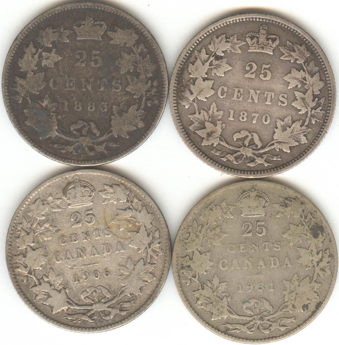 25 Cents 1870 VG, 1883H G, 1906 VG Large Crown & 1931 VG.