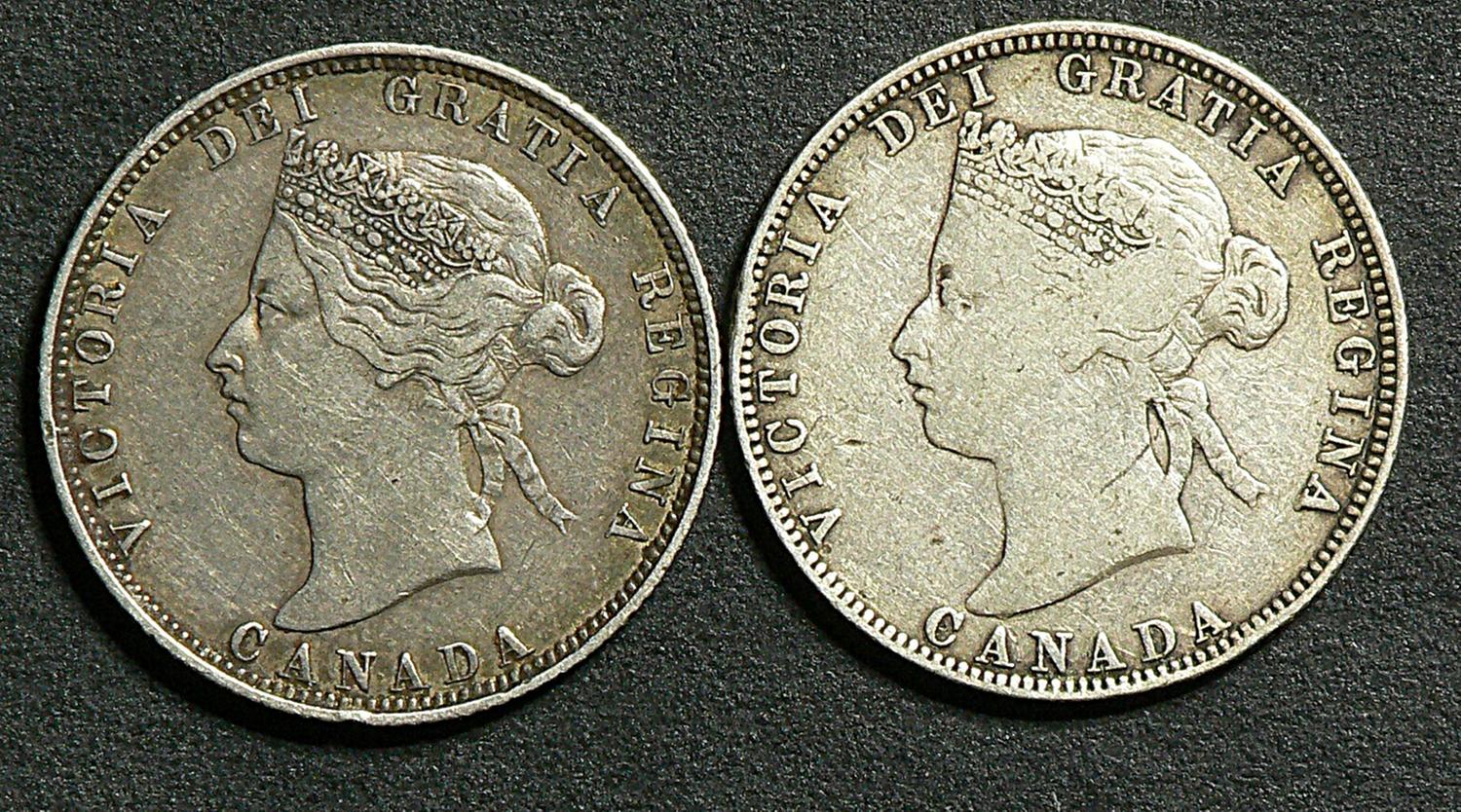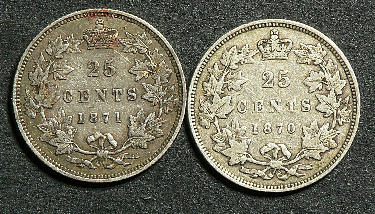 25 Cents 1870, grade VG-8; Obverse 1 & 1871, grade F-15; Obverse 2. Lot of 2 coins.