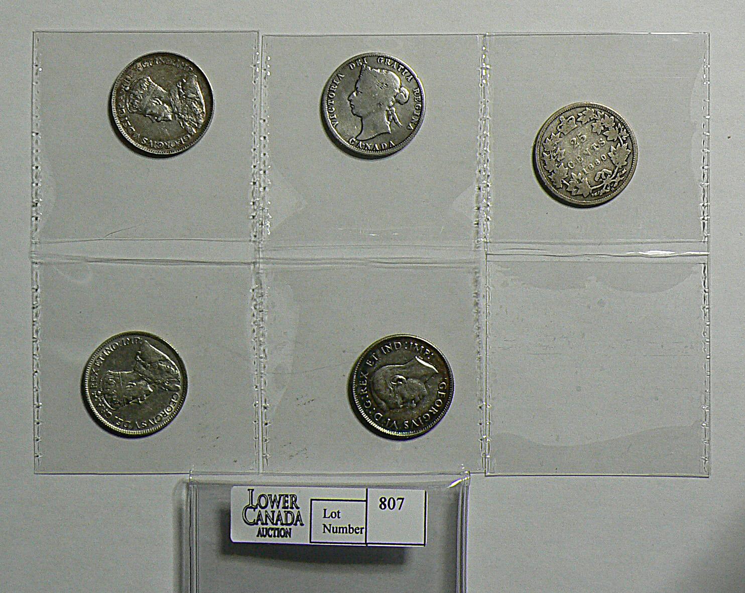 25 Cents 1872H, 1880 Narrow, 1919, 1935, 1944, grades from G - VF. Lot of 5 coins.