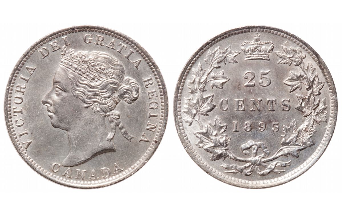 25 Cents. 1893. ICCS graded Gem Uncirculated-65. The 1893 is among the lowest mintages of the Victorian 25 cents, with only 100,000 pieces produced. This coin is powerfully impressed with fully rendered detail throughout, and the obverse is especially clean and lustrous. Effectively brilliant, with only the faintest cast of straw-gold toning. Tied 1 of only 3 finest graded by ICCS.