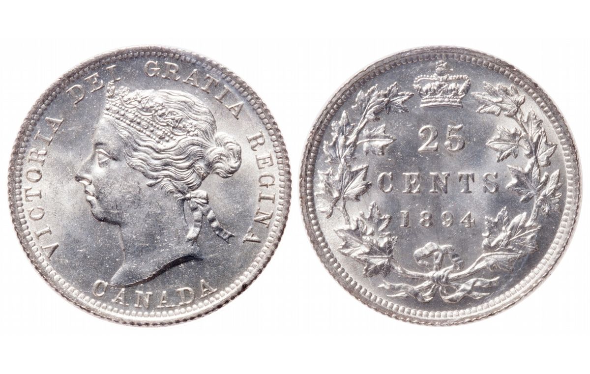 25 Cents. 1894. ICCS graded Gem Uncirculated-65. Brilliant and flashy, with full pinwheel lustre on both sides. The design elements are fully struck and sharp and the fields are virtually flawless - only intense inspection with a loupe will reveal a few minute contact marks. Magnification will also show a trace of obverse die clash along the nose and brow. Tied 1 of only 5 finest graded by ICCS.