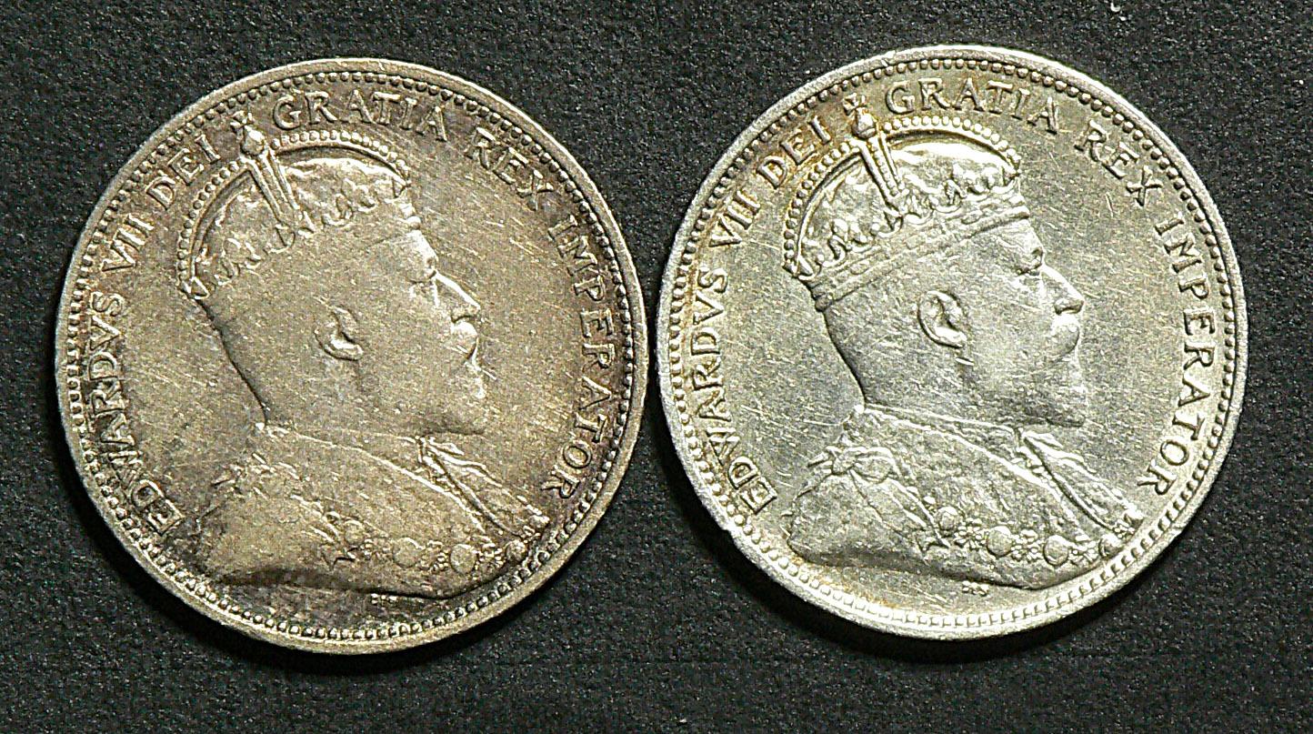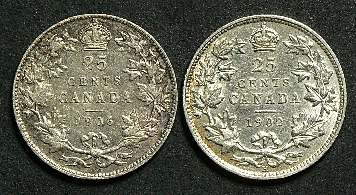 25 Cents 1902H, grade VF-30 & 1906, grade F-15; Large Crown. Lot of 2 coins.