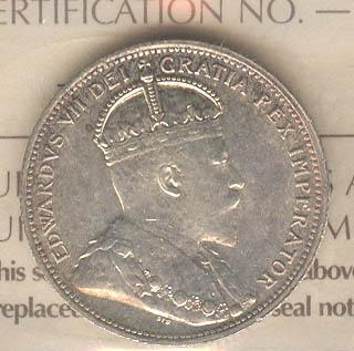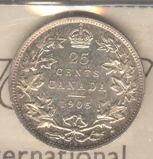 25 Cents 1905, graded ICCS MS-64. Gold toning on part of this beauty.
