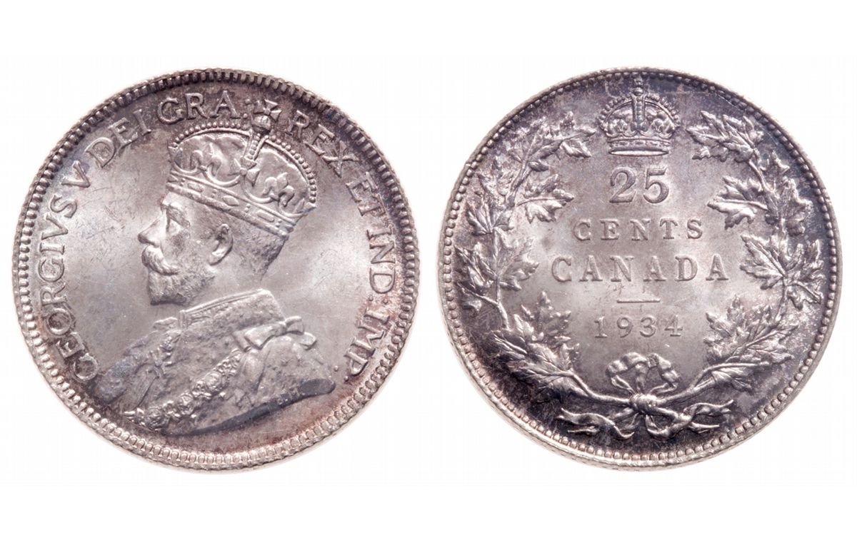 25 Cents. 1934. ICCS graded Gem Uncirculated-65. 1934 was the second lowest mintage of all George V 25 cents, with just 384,350 pieces struck. This example sports a wintery palette of silver-grey toning with touches of deeper steel-blue drifting around the perimeter of both sides. The frosty lustre adds to the icy effect. A few wispy contact marks skate across the obverse fields but do not diminish the generous eye appeal that is created by the boldly struck details. Tied one of 5 finest graded by ICCS, and a very cool coin.