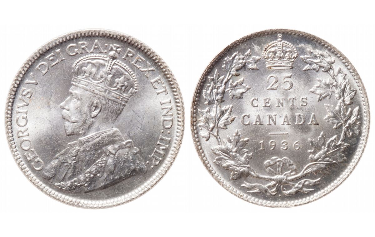25 Cents. 1936 Dot. ICCS graded Gem Uncirculated-65. While the dies for the new 1937 coinage were being prepared at the Paris Mint, demand for currency was high in Canada and the dies from 1936 were pressed into service to fill the need. Marked with a tiny dot below the ribbon, these scarce pieces are now highly collectable. None more so than this, the only Gem ever graded by ICCS. The weak strike sometimes observed on this variety is hardly to be found, as every detail of the engraving is struck in superb detail. Essentially brilliant on the obverse, while a hint of gold and a few flecks of walnut hue grace the reverse. Arresting lustre and satin-like surfaces complete the outstanding eye appeal. The solo finest graded coin by ICCS, and a prize for the uncompromising collector.