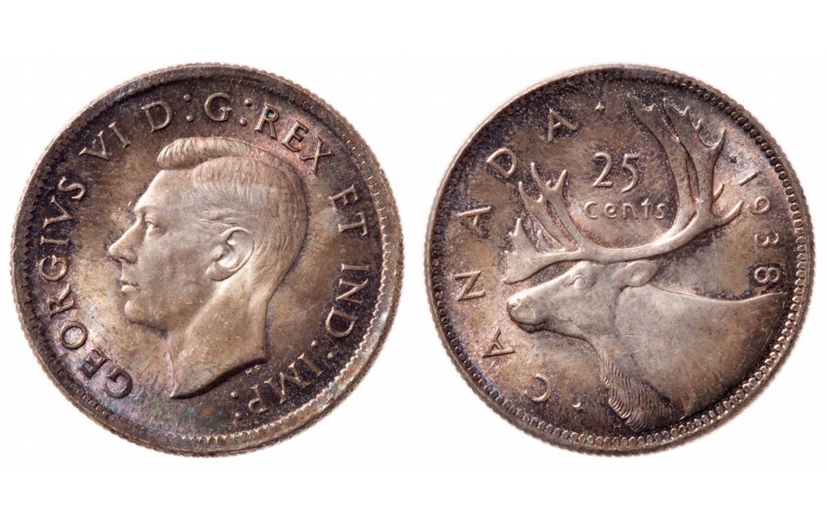25 Cents. 1938. ICCS graded Superb Gem Uncirculated-66. Fully struck with lots of silky lustre. Shades of violet and blue tinge the frosty surfaces. Tied one of only two finest graded by ICCS.