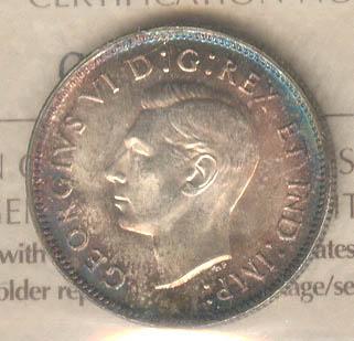25 Cents 1943, graded ICCS MS-64. Gold to dark blue toning .