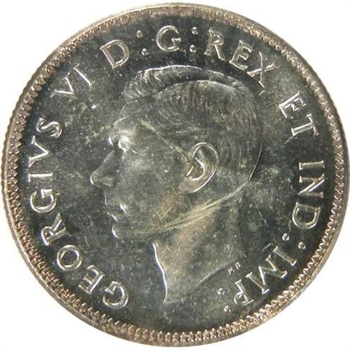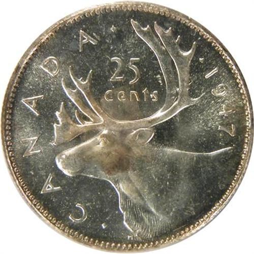 Canada Twenty-Five Cents 1947 Dot Norweb ICCS MS-64. This is a fully struck and strongly lustrous piece with near flawless surfaces that have a very pale golden toning. It is tied as the fourth highest graded by ICCS