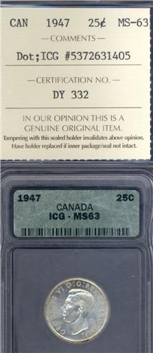 25 Cents 1947, ICG certified MS-63; Dot, white, ICCS Cross Graded MS-63; Dot.