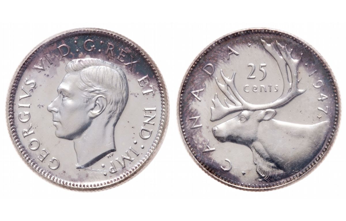 25 Cents. 1947 Maple Leaf. Cameo. ICCS graded Specimen-67. Deep mirror fields contrast dazzlingly with the frosted Cameo designs. Gunmetal blue toning rings the otherwise brilliant surfaces. Tied one of only 4 finest graded by ICCS.