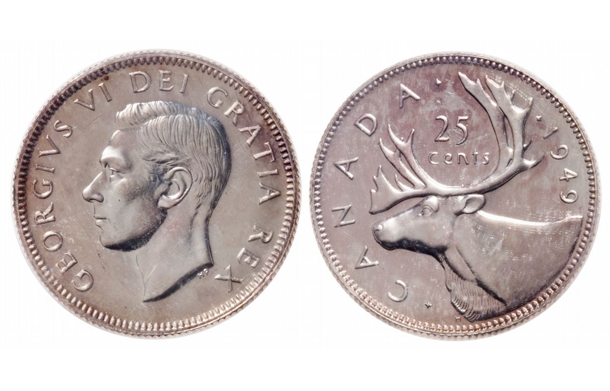 25 Cents. 1949. ICCS graded Specimen-66. Top 7 census, with only 3 coins graded finer by ICCS in SP-67.