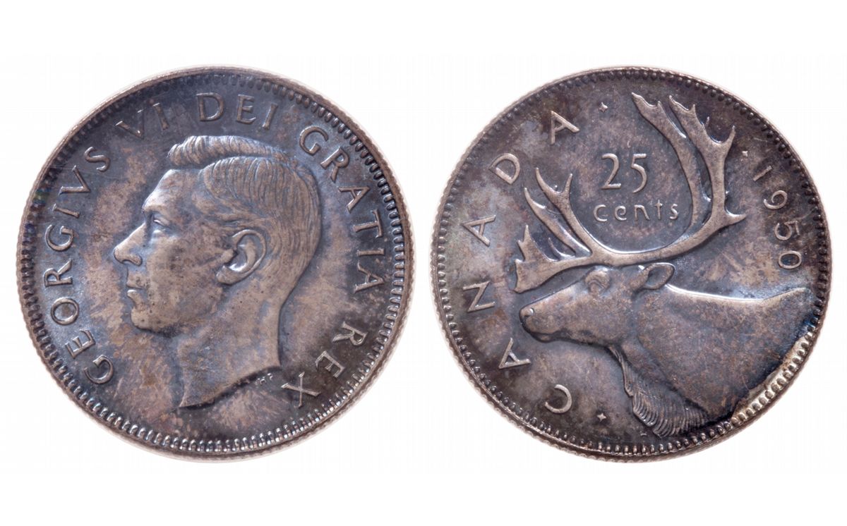 25 Cents. 1950. ICCS graded Superb Gem Uncirculated-66. The well-struck and lustrous surfaces of this alluring coin are toned to a translucent smoky grey, with marvellous artistic accents of chestnut and Oxford blue that outline the design elements. Distinctly appealing. Tied 1 of 7 finest graded by ICCS.