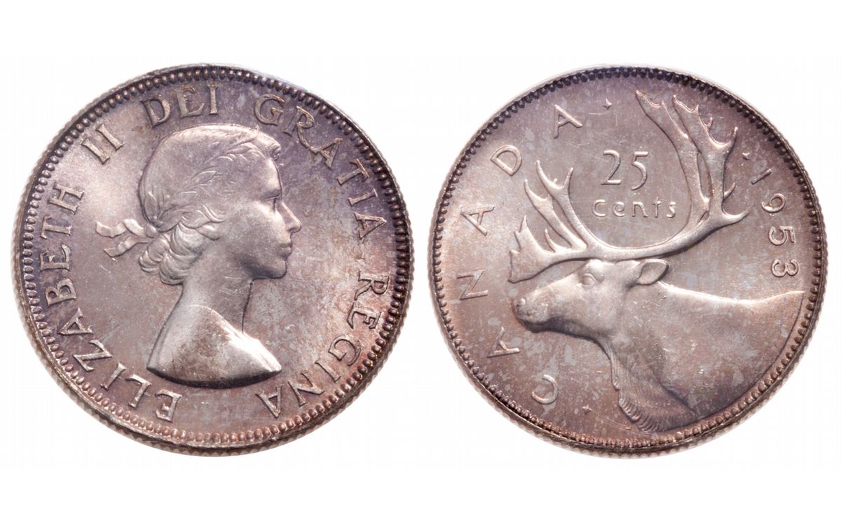 25 Cents. 1953. Large Date. ICCS graded Superb Gem Uncirculated-66. Flashy pinwheel lustre on the obverse, while the reverse fields are mirror with a Cameo-like frosting on the design. Tied 1 of 4 finest graded by ICCS.