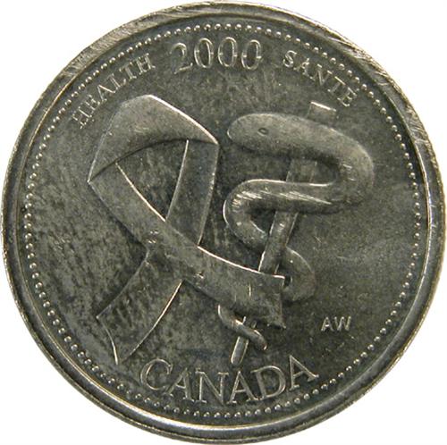 Canada 25 Cents 2000 Health, Struck on a Non-Magnetic Planchet. 6.12 grams, AU-Uncirculated