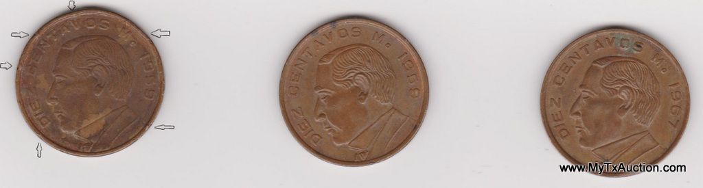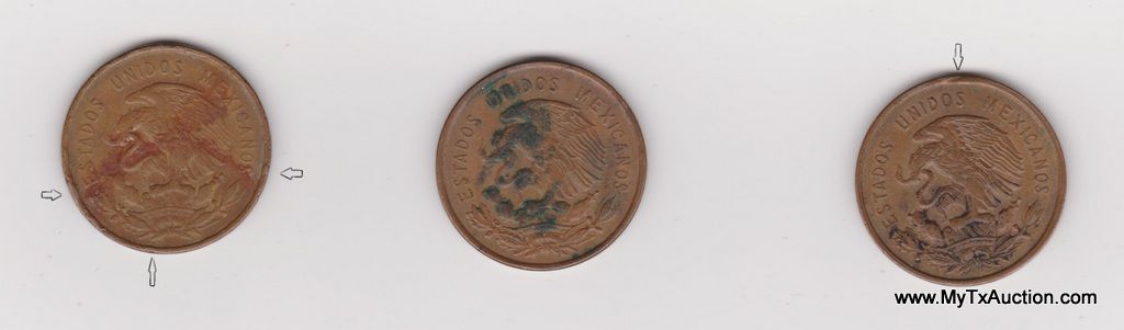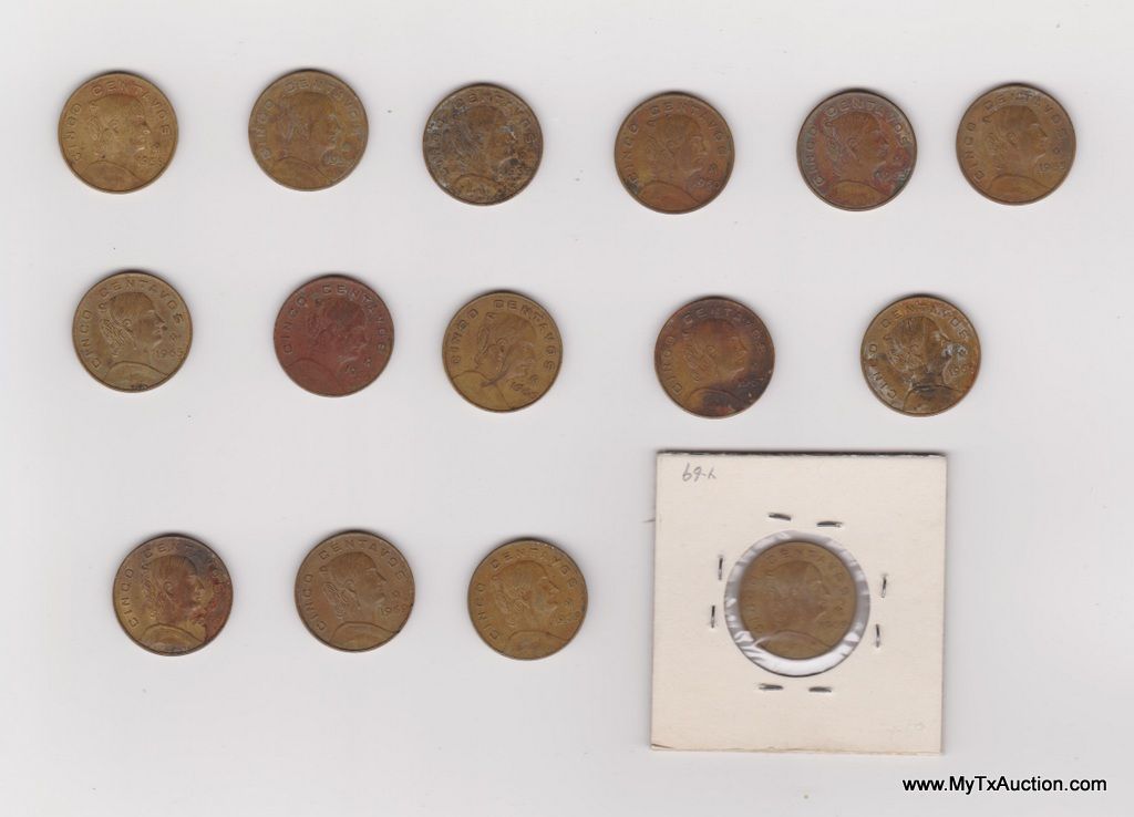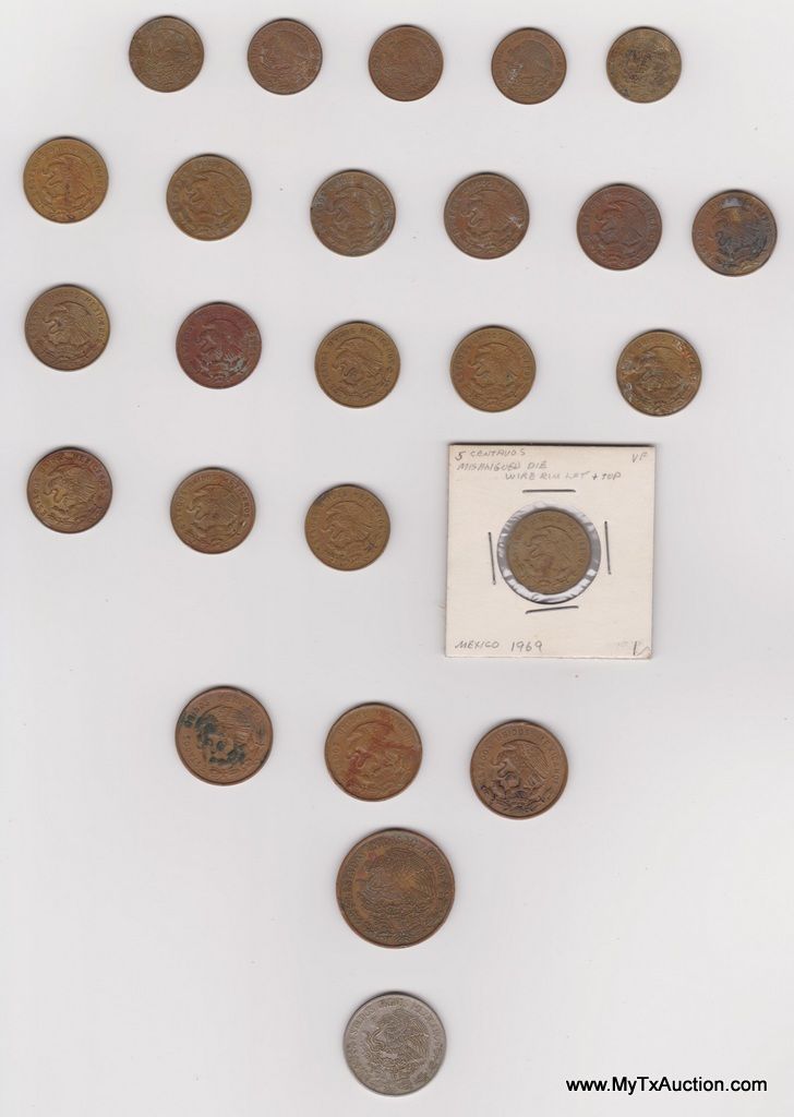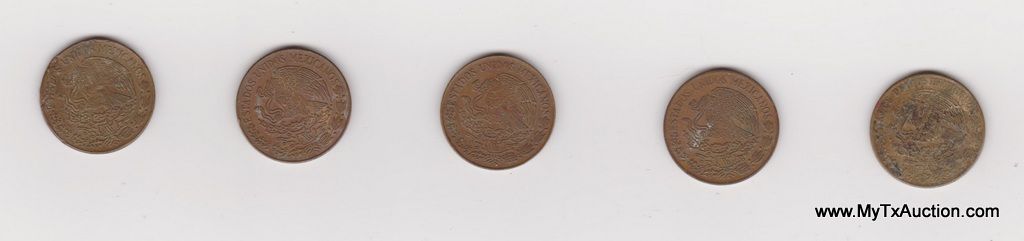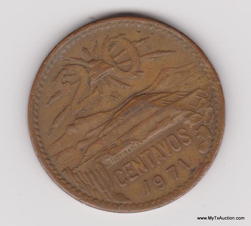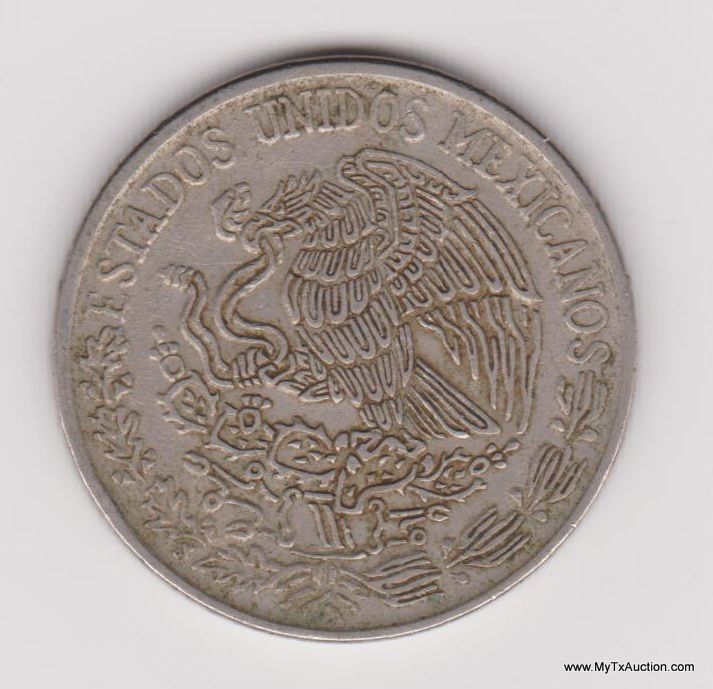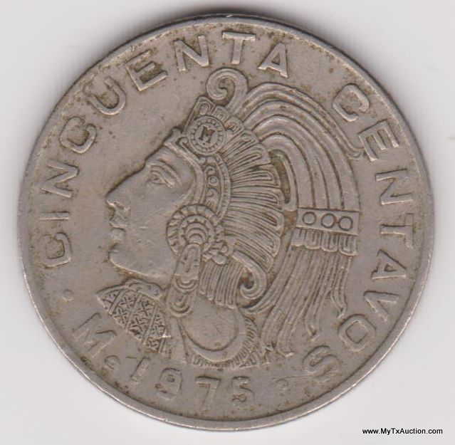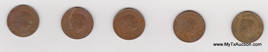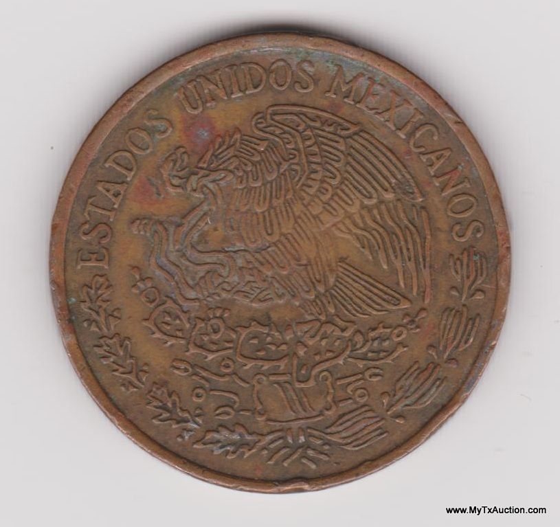 1-1956, 2-1958, 1-1959, 1-1960, 2-1963, 1-1965, 2-1966, 1-1967, & 4-1969 5 Centavos large type Country:Mexico - Coin Mint Years:1954-1969 - Metal:Brass - Weight:4.0g - Diameter:20.5mm - Thickness:1.7mm - Design Obverse:National Arms (Eagle on cactus facing left with snake in beak above wreath), with the inscription forming a semicircle above it Lettering: ESTADOS UNIDOS MEXICANOS - Reverse:Value, Portrait of Josefa Ortiz de Domínguez to the right Lettering:CINCO CENTAVOS (DATE) M - Engravers:Unknown - Shape:Round - Edge:Smooth 1-1970, 2-1972 & 2-1974 5 Centavos small type Country:Mexico - Coin Mint Years:1970-1976 - Metal:Brass - Weight:2.75g - Diameter:18mm - Thickness:1.5mm - Design Obverse:National Arms (Eagle on cactus facing left with snake in beak above wreath), with the inscription forming a semicircle above it Lettering: ESTADOS UNIDOS MEXICANOS -Reverse:Value, Portrait of Josefa Ortiz de Domínguez to the right Lettering:CINCO CENTAVOS (DATE) M - Engravers:Unknown - Shape:Round - Edge:Smooth 2-1959 & 1-1967 10 Centavos Country:Mexico - Coin Mint Years:1955-1967 - Metal:Bronze - Weight:5.5g - Diameter:23.59mm - Thickness:2mm - Design Obverse:Lettering: ESTADOS UNIDOS MEXICANOS - Reverse:Lettering: DIEZ CENTAVOS M. (DATE) - Engravers:Unknown - Shape:Round - Edge:Smooth 1-1971 20 Centavos Type 3 National Emblem Country:Mexico - Coin Mint Years:1971-1974 - Metal:Bronze - Weight:10.0g - Diameter:28.7mm - Thickness:2.2mm - Design Obverse:Lettering: ESTADOS UNIDOS MEXICANOS - Reverse:Lettering:20 CENTAVOS 1971 - Engravers:Unknown - Shape:Round - Edge:Smooth 1-1975 50 Centavos Country:Mexico - Coin Mint Years:1970-1983 - Metal:Copper-nickel - Weight:6.5g - Diameter:25mm - Thickness:1.90mm - Design Obverse:National Arms (Eagle on cactus facing left with snake in beak above wreath), with the inscription forming a semicircle above it Lettering: ESTADOS UNIDOS MEXICANOS - Reverse:Value, Portrait of Cuauhtémoc to the left Some coins from 1975 and 1976 have center dots in the three buttons on the hairdress, while others don't have them Lettering: CINQUENTA CENTAVOS.M.1975 -Engravers:Unknown - Shape:Round - Edge:Milled