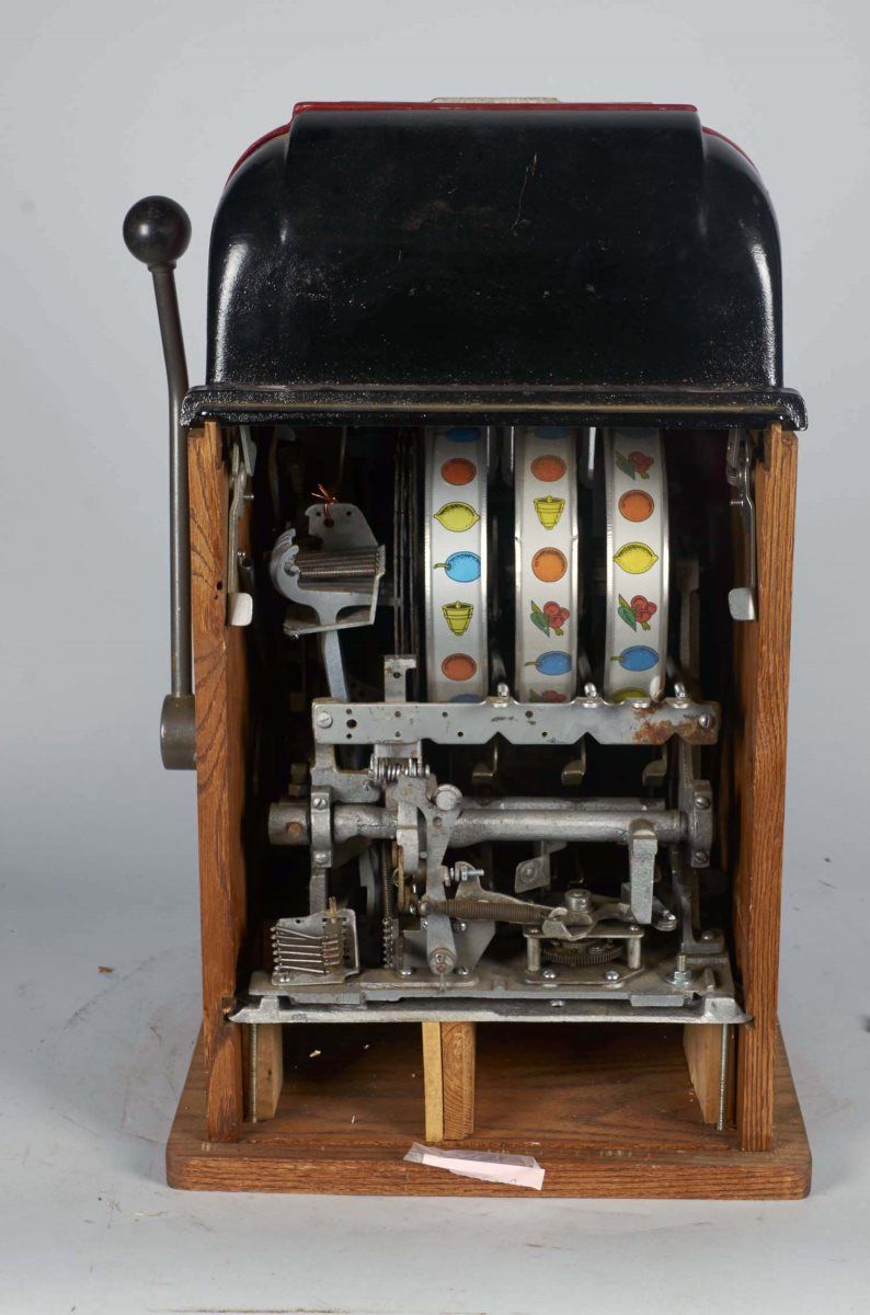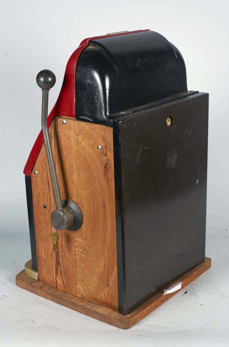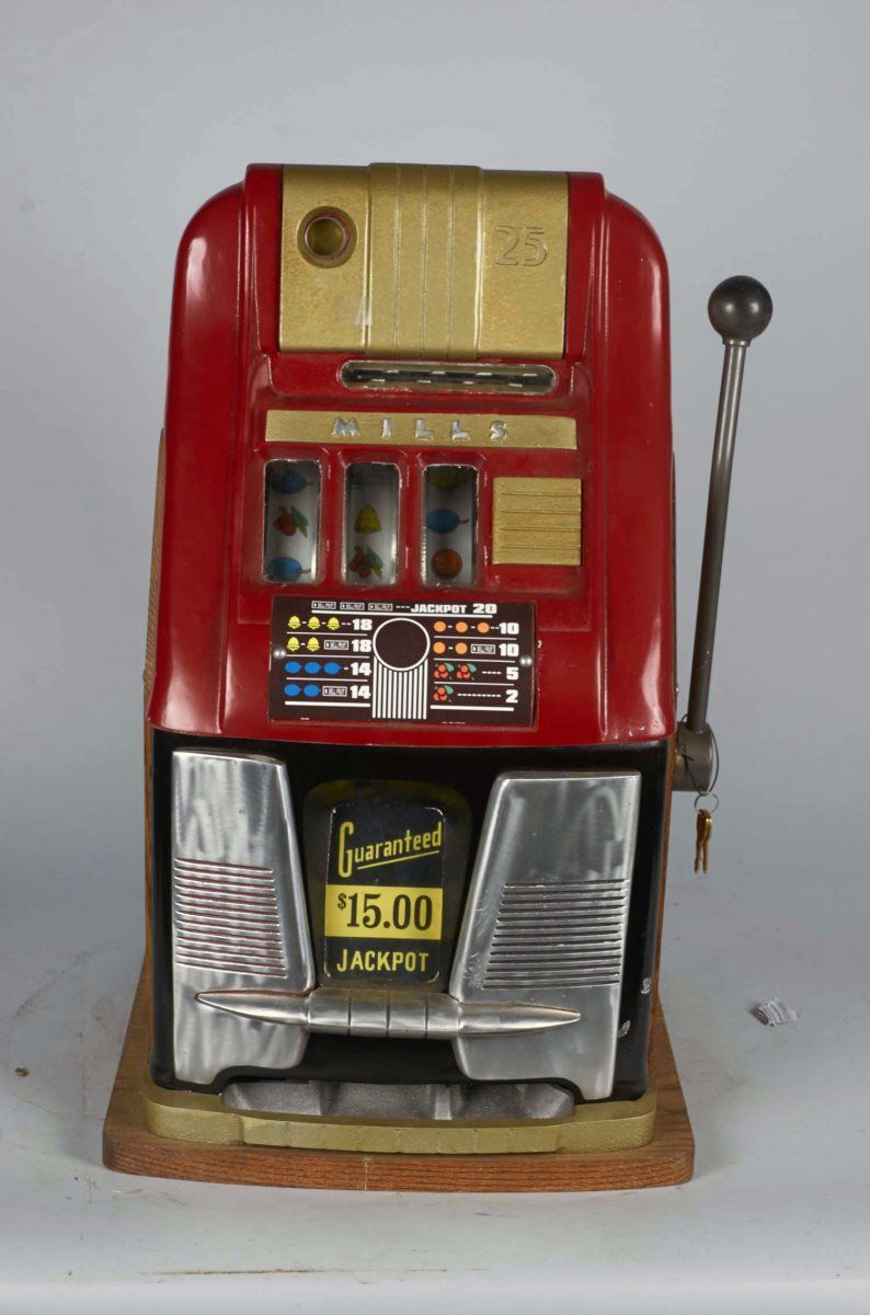 25 ¢ Mills High Top Escalator Bell 3-Reel Slot Machine, Reproduction case, On free play Condition Very good Size 16" x 15" x 25-1/2" Includes key.