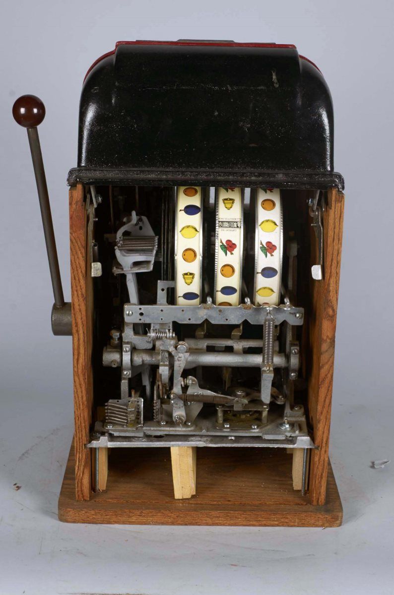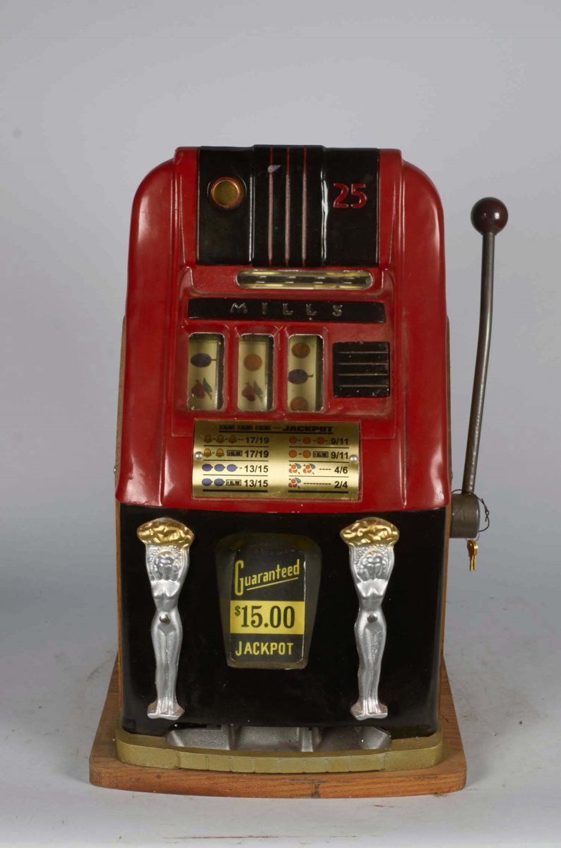 25 ¢ Mills High Top Escalator Bell 3-Reel Slot Machine w/ "Golden Doll" Golden Nugget girls style front castings, Reproduction case, On free play Condition Excellent Size 16" x 15" x 25-1/2" Includes key.