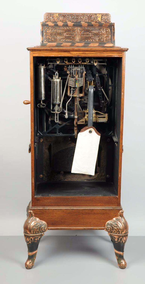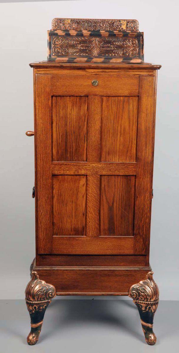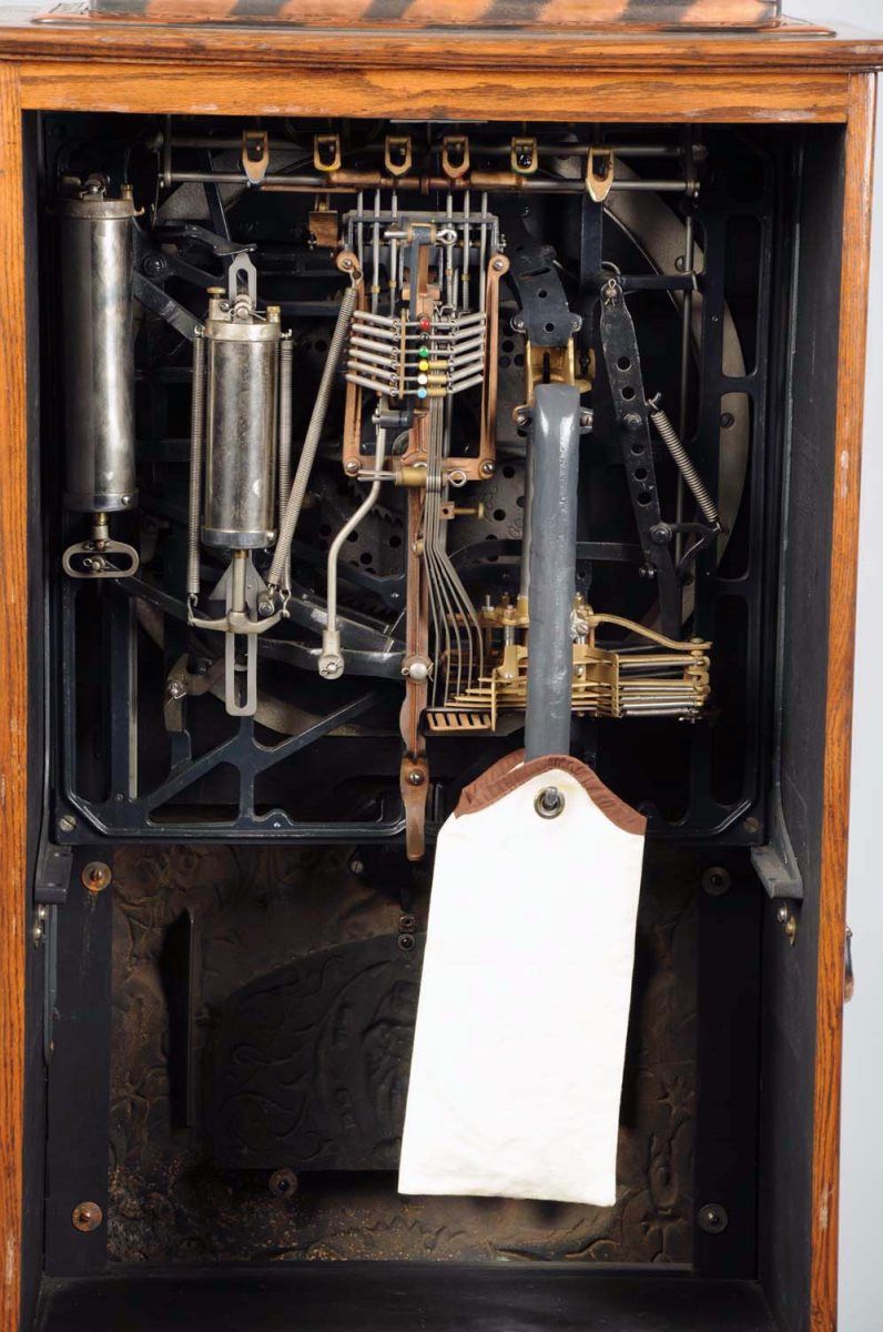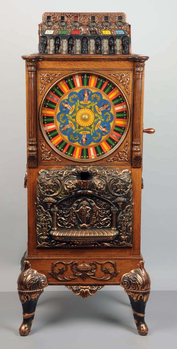 25¢ Caille New Century Puck Upright Floor Wheel Slot Machine c1908, Oak case w/ antique copper trim, Expert states that the original tin wheel is one of the best, Restored, New top sign, Plays & pays w/ keys Condition (Excellent). Size 64" T.