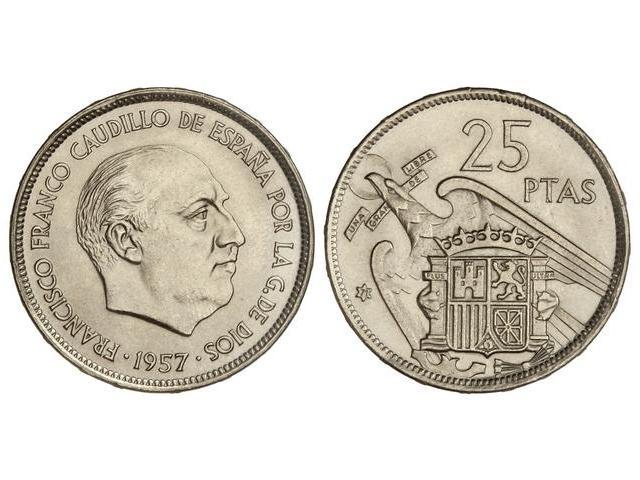 25 Pesetas. 1957 (*71). Con PLUS. Procedente de tira F.N.M.T. PRUEBA.