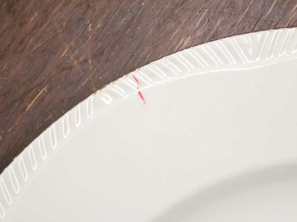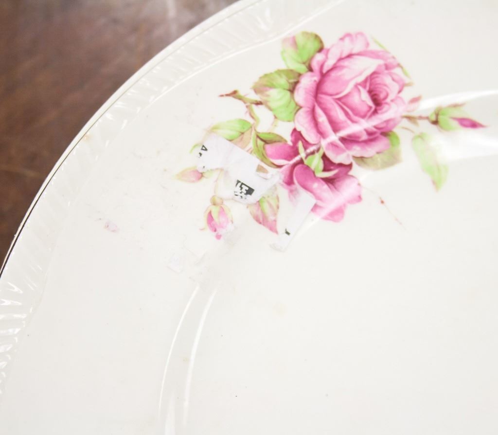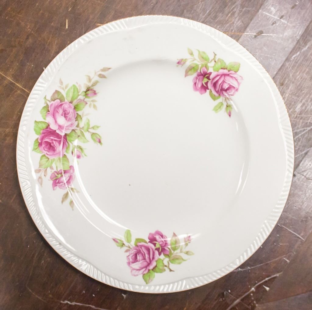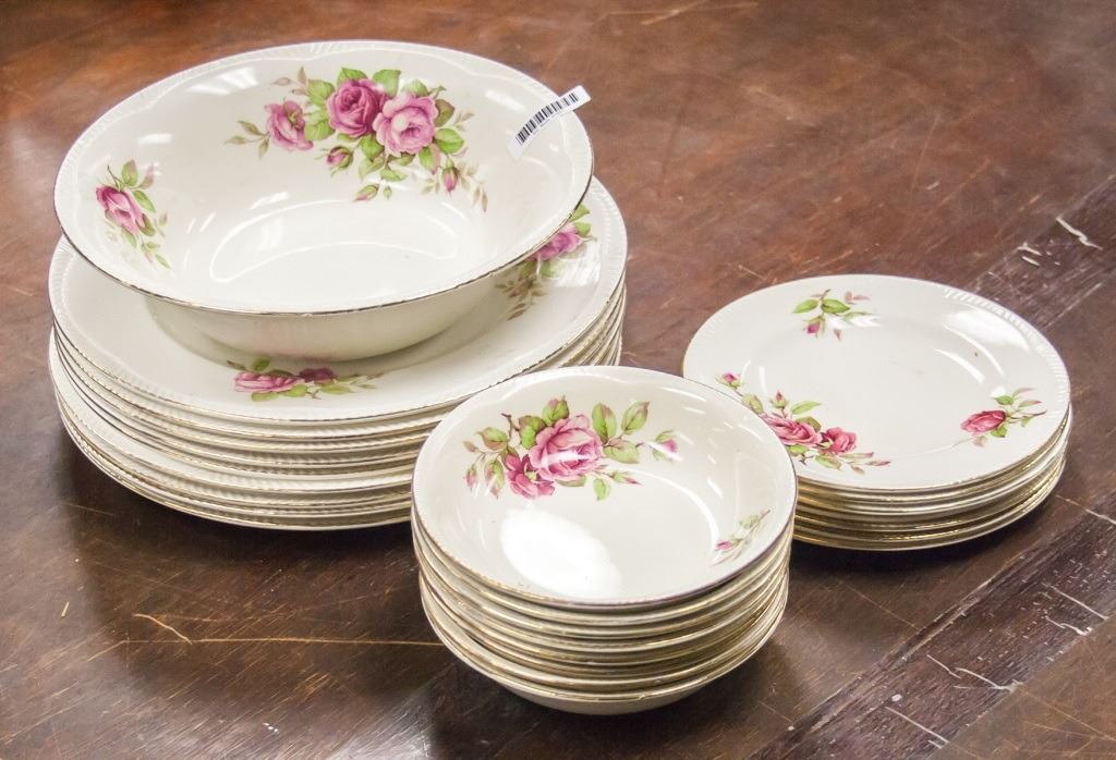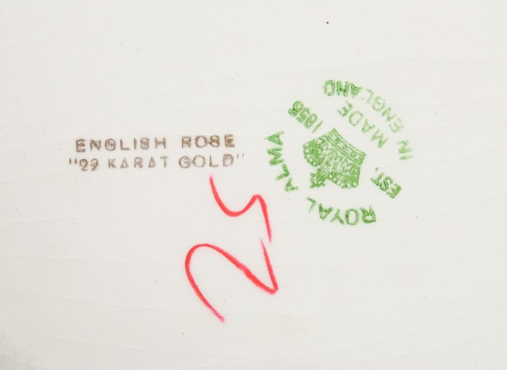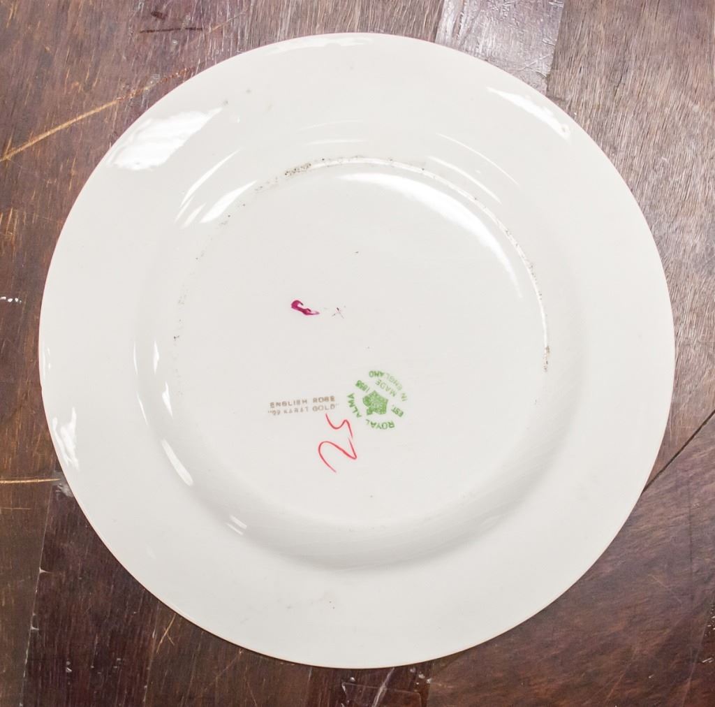 25-piece set of dishware. Including plates and bowls. Painted with flowers. "ENGLISH ROSE 22 KARAT GOLD", "ROYAL ALMA / EST. 1856 / MADE IN ENGLAND" stamped on base. L: 25 cm. 7 kg