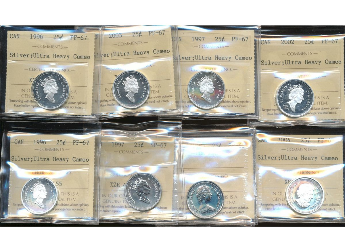 25¢ Proof singles 1996(3), 2001, 2002, 2003, 2004 all PF67 Ultra Heavy Cameo with exception of 2001 PF66. Also includes 1997 25¢ SP67 & 1985 SP68. Lot of 9 coins all ICCS graded some with Cameo designations.