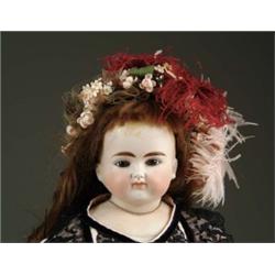 25” SOLID DOME CLOSE MOUTH GLASS EYE TURNED SHOULDER HEAD DOLL. No visible markings. She appears to be on a newer leather body, bisque forearms, leather has been glued higher than normal around shoulder plate, making it impossible to determine condition. RS 1-3570-1186 (100-200)