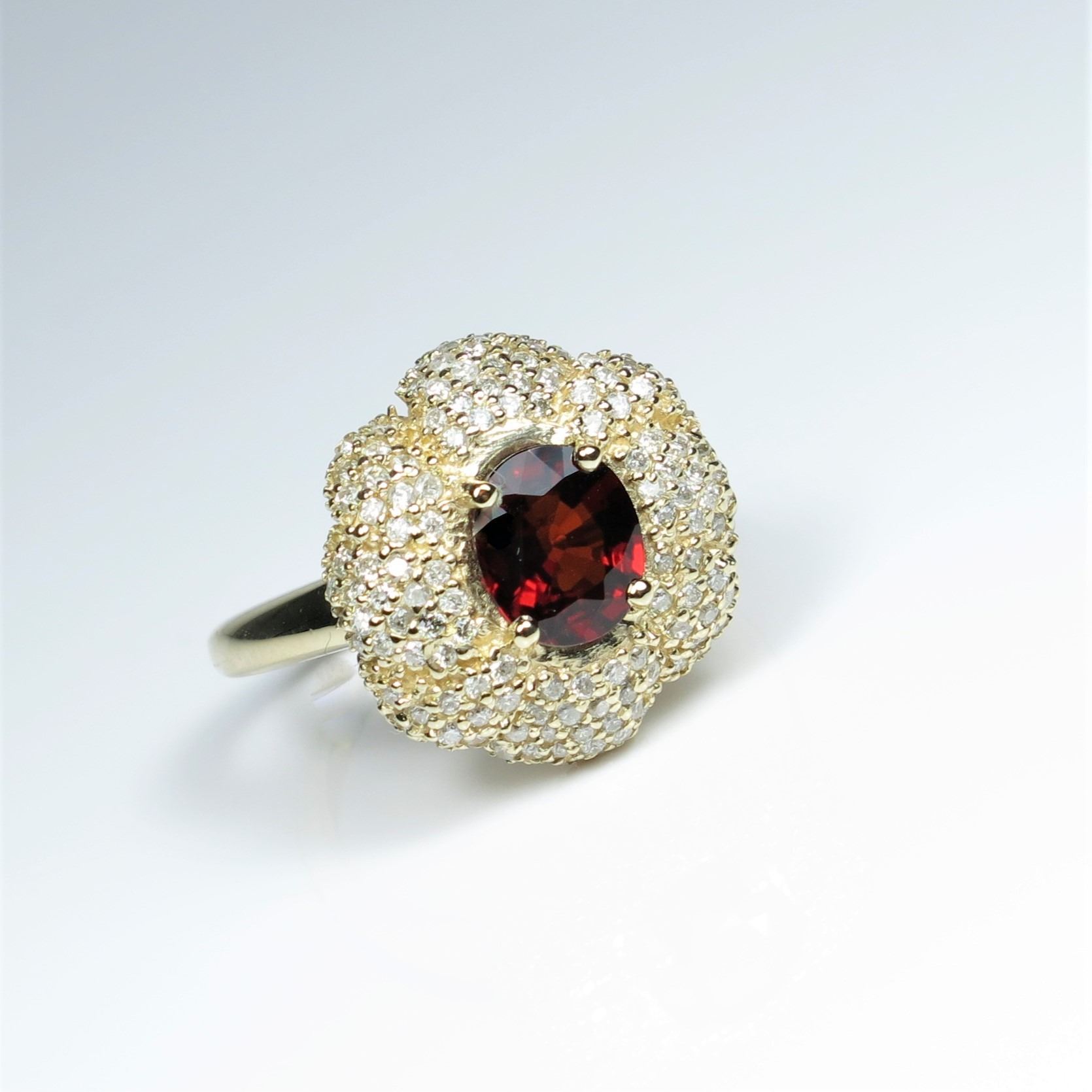 25. Stunningly Beautiful Extra Fine Spessartite Garnet and Diamond Ring featuring a rich red Garnet weighing approx. 2.00 carats accented with over 160 round cut Diamonds set in a 14 karat yellow gold custom made setting. Retail $3,000-$4,000 Estimates $1,200-$1,800