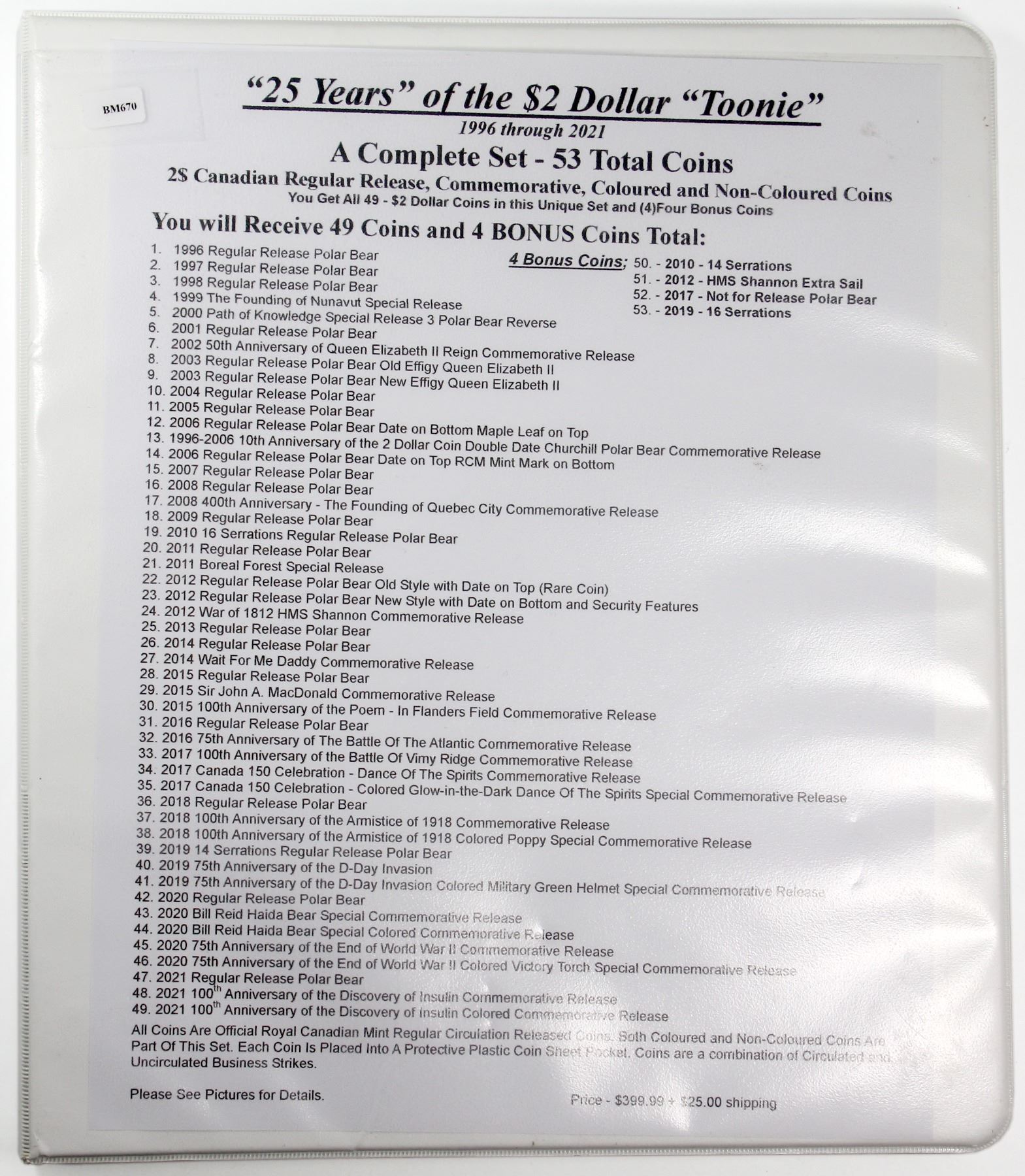 25 Years of the $2 Set (53 Coins in total) This collections contains a near complete collection of $2 from 1996-2021 and almost all varieties including the rare 2010 14 Serrations, 2012 HMS Shannon -Extra Sail, 2017 Polar Bear & 2019 16 Serrations. Coins are a mix of Circulated and Uncirculated and Colour and non colour issues.
